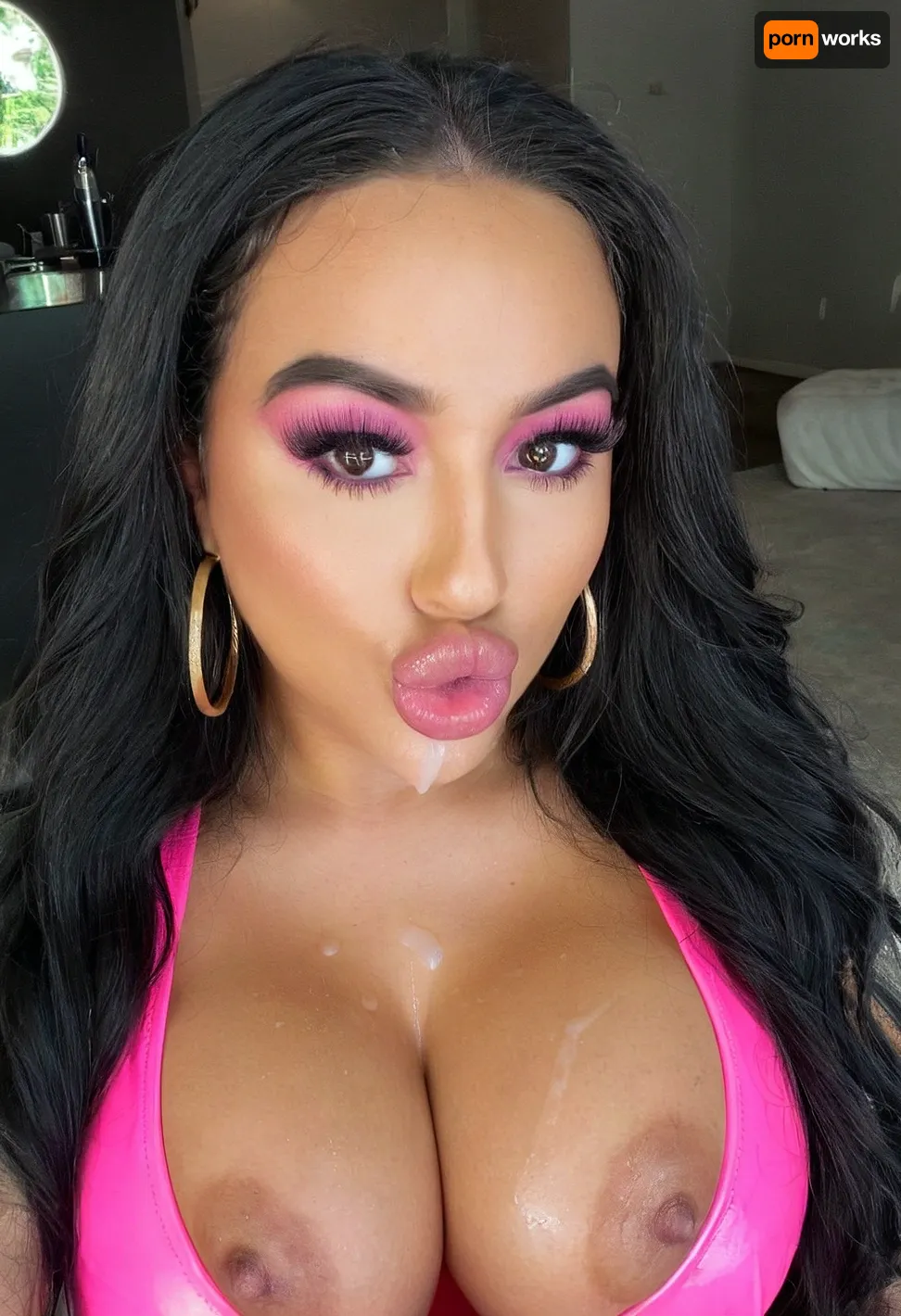 Selfie, headshot, 8k, intricate details. A gorgeous latina bimbo, looking at viewer, big dark eyes, big glossy pink lips, pouting, vibrant makeup, long thick eyeliner, big fake eyelashes, beautiful long dark hair, huge thick gold hoop earring, eyeliner, graphic eyeliner, thick eyelashes, dark skin, busty, cleavage, clothed in pink latex, bmbplora, cum facial, cum plastered, cum dripping down, <lora:406734_training_data:.5>, <lora:bimboxl_02:.6>, <lora:clothed_small:.5>, <lora:1122530_training_data:.6>, <lora:Pouting_SDXL:.6>