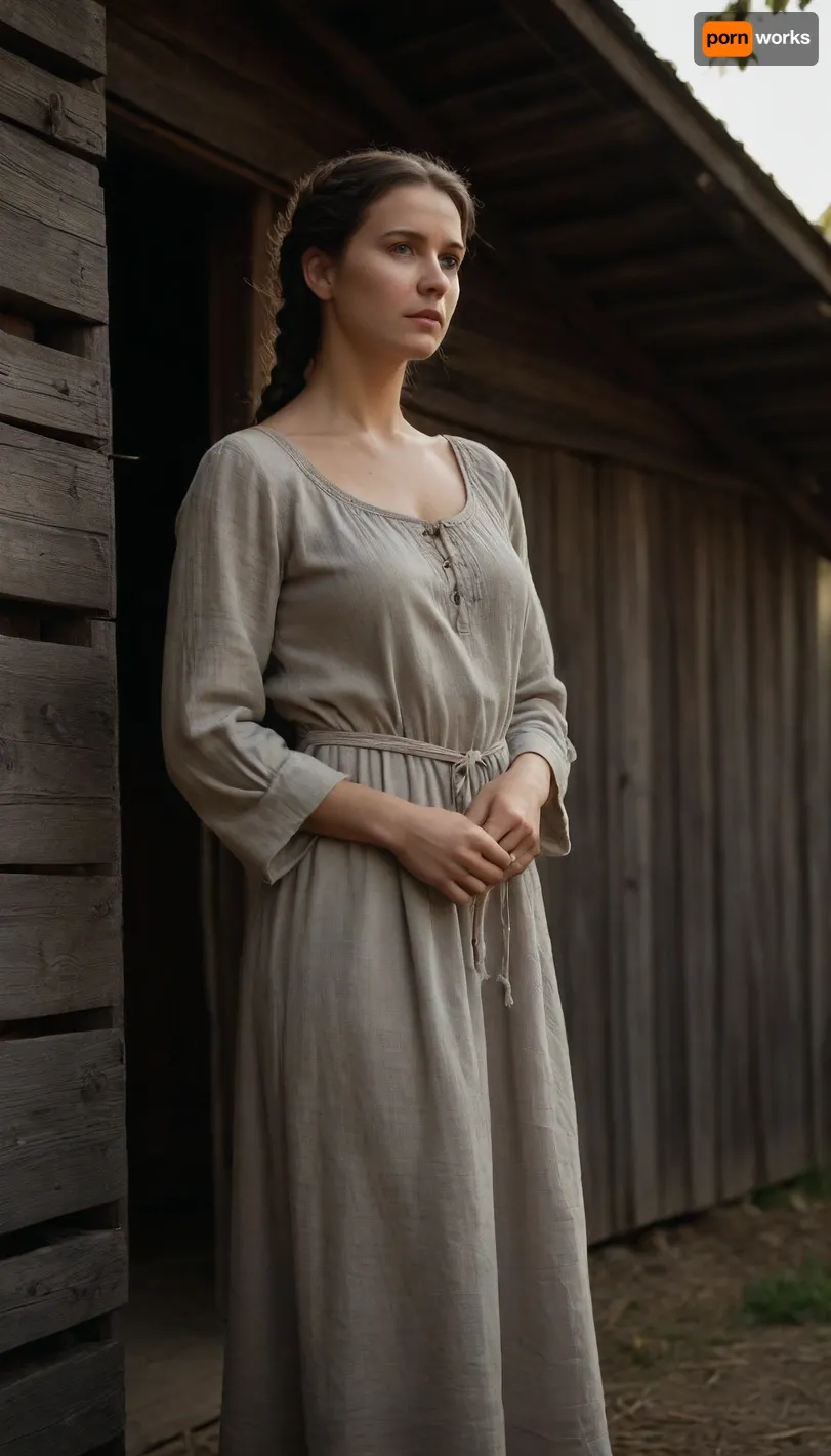 A beautiful curvy peasant woman, 40 years old, of Slavic ethnicity, stands near a dilapidated wooden barn. Her face holds a calm, yet weary expression. Her dark brown eyes, slightly downturned. She wears a linen chemise, antique in style, reaching her ankles. The garment is unbelted, with long, wide sleeves that fall loosely to her wrists, unfastened. A simple neckline is tied with thin, dark linen tapes. The texture of the linen is coarse, slightly rumpled. Her hands, calloused and strong, hang loosely at her sides, her posture stooped yet dignified. The woman's dark hair is pulled back in a simple braid. The barn, constructed from aged, grey wood, shows signs of decay—warped planks. The background is a muted palette of browns, greens, and greys, reflecting a late afternoon light. The overall style evokes a realistic portrayal, reminiscent of Russian realism, with a focus on capturing the raw honesty and dignity of rural life. The composition is a three-quarter view, slightly low angle, emphasizing the woman's stature against the imposing backdrop of the barn. The lighting is natural, diffused sunlight casting soft shadows, enhancing the textures and details of both the woman and her surroundings., vntgdrwngCE, style, middleagesstyle-20240816-1, <lora:734192_training_data:1.1>