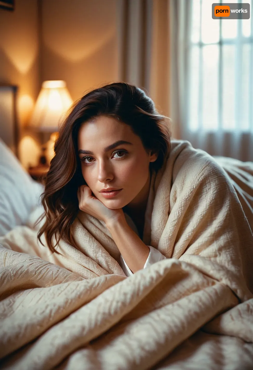 full portrait, soft warm light, in bed, cozy, laying under a blanket full portrait, soft warm light, in bed, cozy, laying under a blanket
