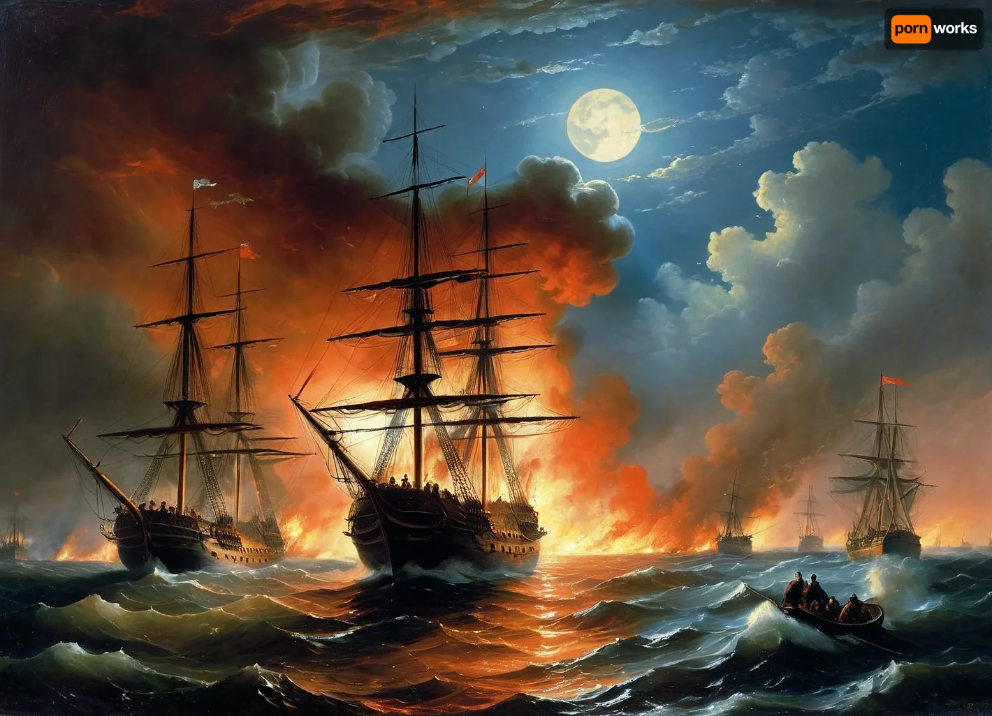 The painting is in the style of the Russian artist Ivan Konstantinovich Aivazovsky.In the depths of the bay, burning ships can be seen sinking, fragments of masts flying apart from the explosion. Rising flames with scarlet-blue smoke mix with clouds, and the light of the moon illuminates the hellish mixture of fire and water. In the foreground, the flagship of the Russian fleet "Three Hierarchs" stands in dark silhouette, to which a boat with the crew of the fireman D. S. Ilyin approaches. Behind the "Three Hierarchs" are "Europa" and "Rostislav", on the left in the background is "Don't touch me", (the location of the Russian ships is slightly "edited" by Aivazovsky, the ships are closer to each other than they were in real combat), . On the left in the foreground, Turkish sailors can be seen in the water, clinging to the wreckage of ships in order not to drown. In the background, the city is illuminated by the glow of the fire. The composition is built on a sharp contrast between flames, pale moonlight, clouds of smoke and fire covering the sky — all this creates the impression of tension and drama of the events taking place. Visually, the center of the picture is not even the Russian ships in the foreground, visible more as silhouettes against the background of clouds of flame and smoke, but the burning formation of the Turkish fleet., painted in the so-called oriental taste. The painting is in the style of the Russian artist Ivan Konstantinovich Aivazovsky.In the depths of the bay, burning ships can be seen sinking, fragments of masts flying apart from the explosion. Rising flames with scarlet-blue smoke mix with clouds, and the light of the moon illuminates the hellish mixture of fire and water. In the foreground, the flagship of the Russian fleet "Three Hierarchs" stands in dark silhouette, to which a boat with the crew of the fireman D. S. Ilyin approaches. Behind the "Three Hierarchs" are "Europa" and "Rostislav", on the left in the background is "Don't touch me", (the location of the Russian ships is slightly "edited" by Aivazovsky, the ships are closer to each other than they were in real combat), . On the left in the foreground, Turkish sailors can be seen in the water, clinging to the wreckage of ships in order not to drown. In the background, the city is illuminated by the glow of the fire. The composition is built on a sharp contrast between flames, pale moonlight, clouds of smoke and fire covering the sky — all this creates the impression of tension and drama of the events taking place. Visually, the center of the picture is not even the Russian ships in the foreground, visible more as silhouettes against the background of clouds of flame and smoke, but the burning formation of the Turkish fleet., painted in the so-called oriental taste.