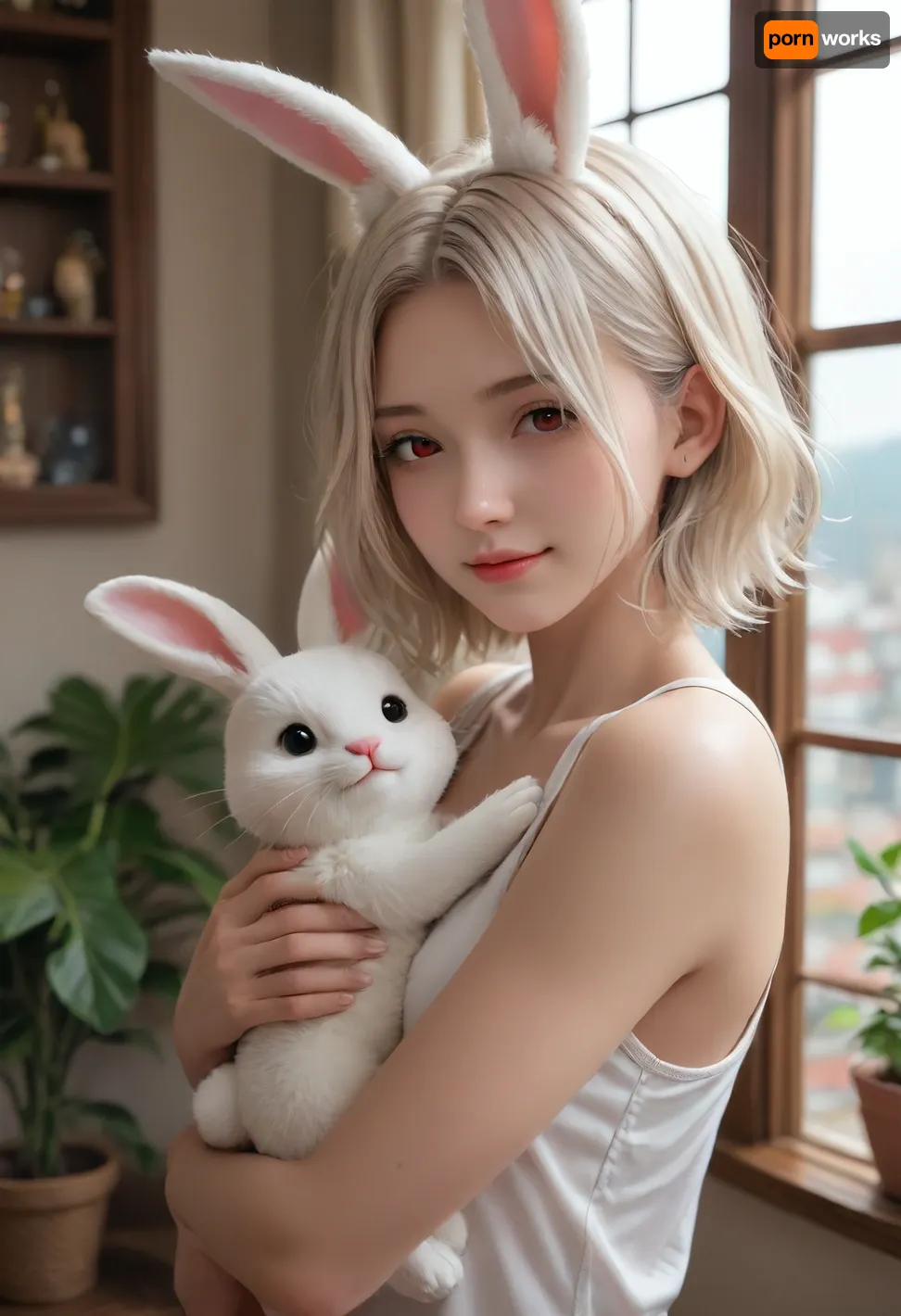 score_9, score_8_up, score_7_up, The image is an illustration of a young woman with long white hair and red eyes. She is wearing a white tank top and has a pair of bunny ears on her head. The woman is holding a white rabbit in her arms and is kissing it tenderly. The rabbit has its eyes closed and appears to be sleeping. The background is a room with a window and a plant. The overall mood of the image is peaceful and serene. dark_skin, rating, safe, white_hair, heart, animal_ears, 1girl, red_eyes, long_hair, parted_bangs, bunny_ears, hug, bare_shoulders, window, smile, half-closed_eyes, indoors, looking_at_viewer, one_eye_closed score_9, score_8_up, score_7_up, The image is an illustration of a young woman with long white hair and red eyes. She is wearing a white tank top and has a pair of bunny ears on her head. The woman is holding a white rabbit in her arms and is kissing it tenderly. The rabbit has its eyes closed and appears to be sleeping. The background is a room with a window and a plant. The overall mood of the image is peaceful and serene. dark_skin, rating, safe, white_hair, heart, animal_ears, 1girl, red_eyes, long_hair, parted_bangs, bunny_ears, hug, bare_shoulders, window, smile, half-closed_eyes, indoors, looking_at_viewer, one_eye_closed