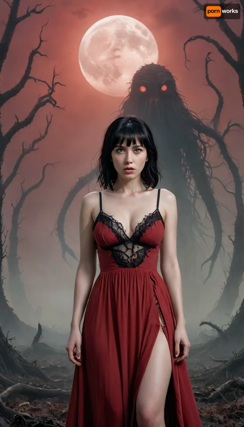 a pale beautiful busty woman with black hair and bangs trapped in a horrific landscape, long torn dress, eye contact, frightened expression, female focus. EdobHorrorLandscape, fog, mucus, simple background, huge looming creature with tentacles and many eyes, sharp teeth, silhouette, spikes, moon, forest, red sky, dark, cinematic, frightening, <lora:EdobHorrorLandscape:2>, <lora:xl_more_art-full_v1:2>, <lora:add-detail-xl:2>