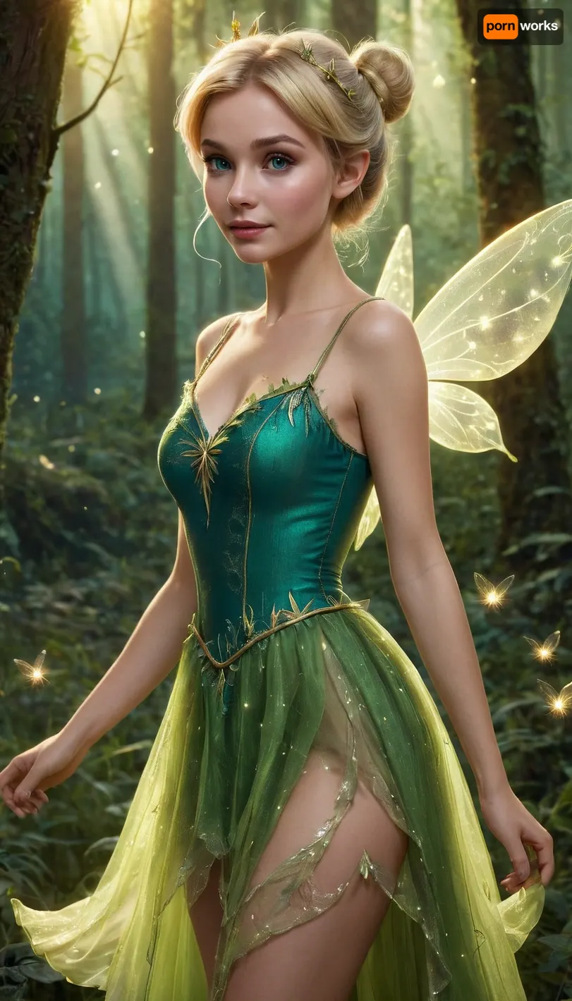 Tinkerbell, petite blonde fairy, pixie stature, blonde hair in messy bun, blue eyes, cute, young, beautiful face, wearing a tattered green dress, green fairy wings, tiny waist, slender petite body, pale skin, fair skin, glowing skin, magical fairy forest background, enchanted, glowing green fireflies, moonlight, magical appearance, highest quality, dreamlike, 4k uhd, fairy, dress, <lora:xl_fairy_dress-1.0:.6> Tinkerbell, petite blonde fairy, pixie stature, blonde hair in messy bun, blue eyes, cute, young, beautiful face, wearing a tattered green dress, green fairy wings, tiny waist, slender petite body, pale skin, fair skin, glowing skin, magical fairy forest background, enchanted, glowing green fireflies, moonlight, magical appearance, highest quality, dreamlike, 4k uhd, fairy, dress, <lora:xl_fairy_dress-1.0:.6>