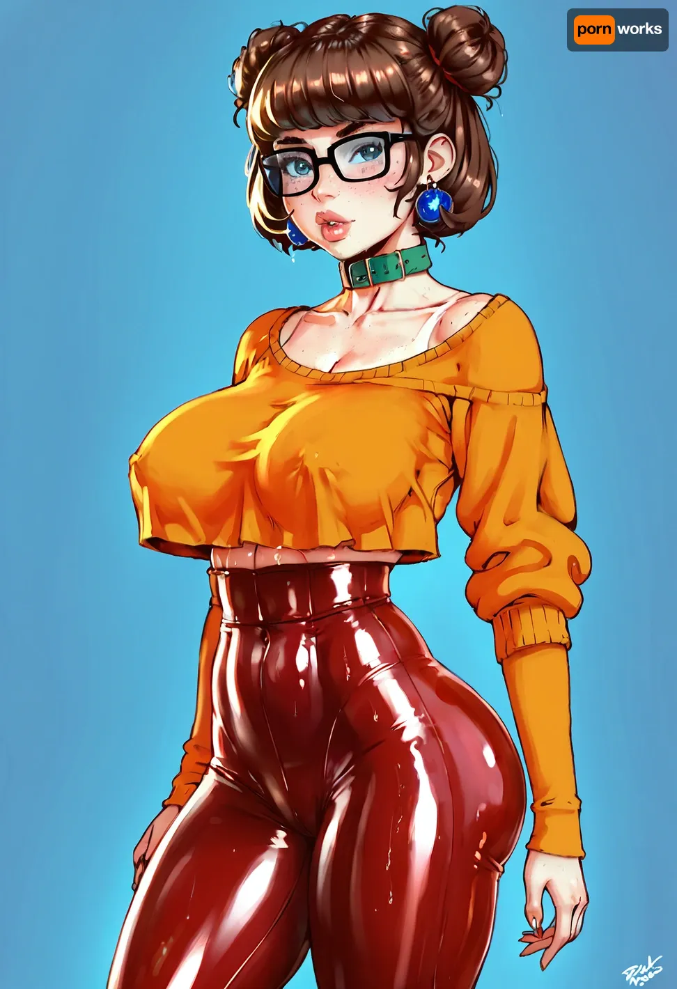 Super realistic 8k style, score_9, score_8_up, score_7_up, FILM PHOTOGRAPHY STYLE, velma dinkley from scooby doo, brunette, two buns hairstyle, slut, extremely pretty face, oiled skin, tanned, huge natural saggy tits, solid color background, huge natural tits, big boobs, fit, super waist, waist, fit thighs, medium tight ass, medium round ass, collar, womens off shoulder graphic tee stretched crop top, pouting big lips, looking at viewer, horny, long legs, hdr, ultra detailed face, clothe on, teasing viewer, sexy poses, <lora:detailed_notrigger:2>, <lora:add-detail-xl:.8>, <lora:LCMTurboMix_Euler_A_fix:.8>, <lora:677862_training_data:.8>