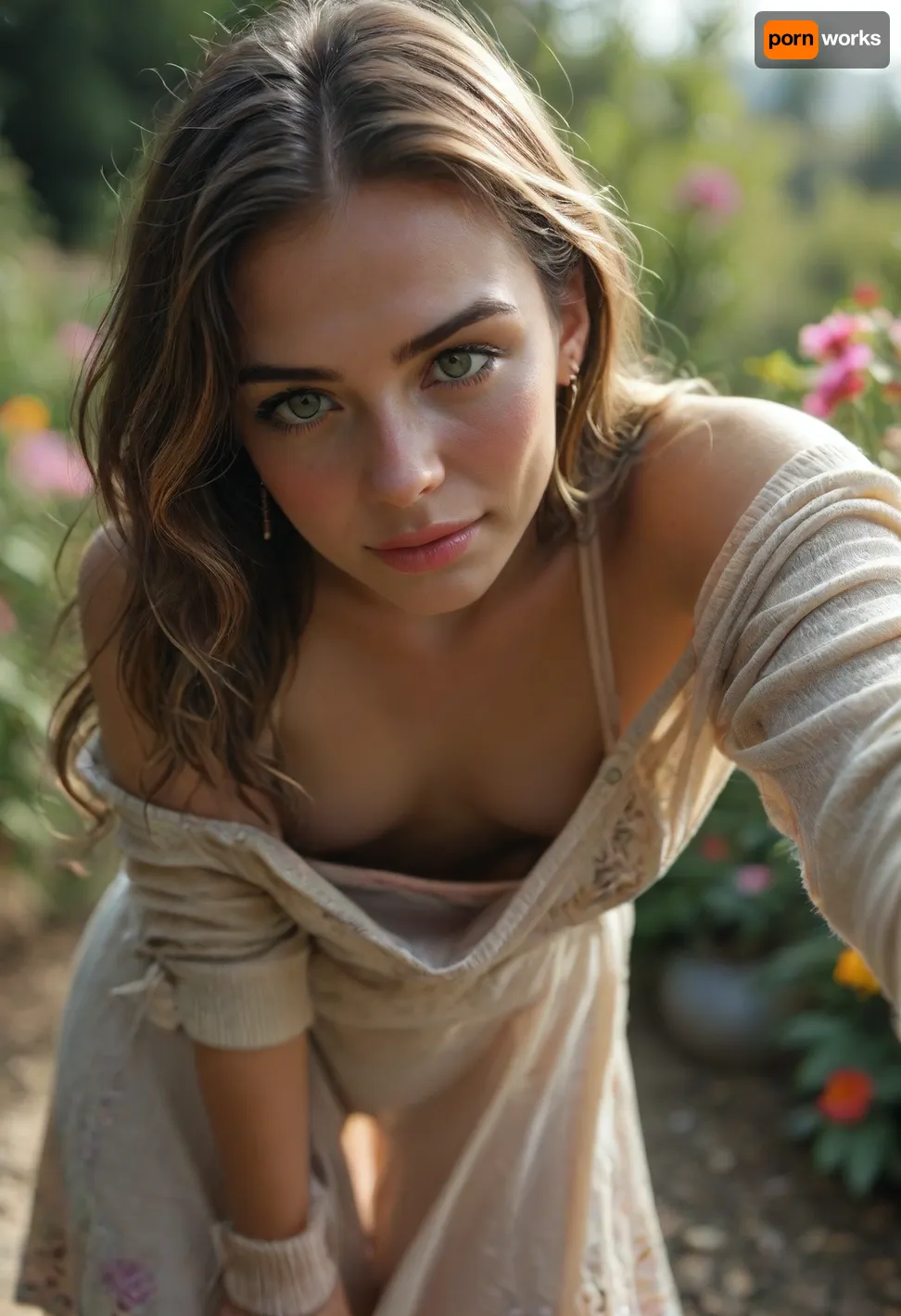 ​Focus, Ultra-sharp focus on the subject, with a clean separation from the background, <lora:add-detail-xl:2>, <lora:BUT_SDXL_SHS:1>, <lora:MJ52:1.4>, <lora:DetailedEyes_V3:1.7> Woman bends down and sideways to look into the lens of the camera, she is lit by golden sunset light, as she stands in her English cottage garden, surrounded by thousands of beautiful flowers, ((very slender body)), ((small tits)), ((flat chest)), areolas visible, nipples visible, ((((downblouse)))), site view, (((side boob))), Looking Directly into the Camera with a sweet, shy, and slightly playful smile.