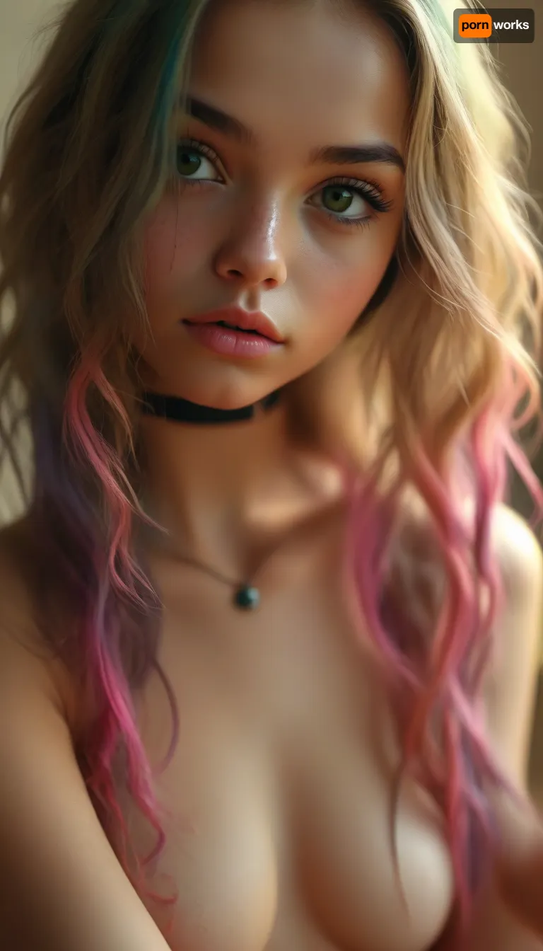 Dynamic View, Dynamic PoseRealistic XHyperreal Max Quality High detailed, ultra flirty, kinkiest cutie, seducing expression, UHD 8K, sepia, masterpiece, score 9, score 8 up, score 7 up, score_9, score_8_up, score_7_up, ((soft focus)), blurred background, 8k uhd, ((full body side view)), detailed photo of very deeply tanned naked naked girl, lots of details, three-dimensional, epic, professional lighting, ### full body view, indian, dark skin, 18 year old, long rainbow hair, black choker, pink lipstick, nipple rings, belly ring, ripped revealing clothes, goth, small breasts, full body view from behind, long legs, tiny feet, perfect face, green eyes, cute, closeup, petite body, full body photo, beautiful face, but, great, lighting, <lora:MJ52:.3>, <lora:BUT_SDXL_SHS:.8>, <lora:great_lighting:.8>, <lora:EnvyStarlightPrettyEyes01:.8>