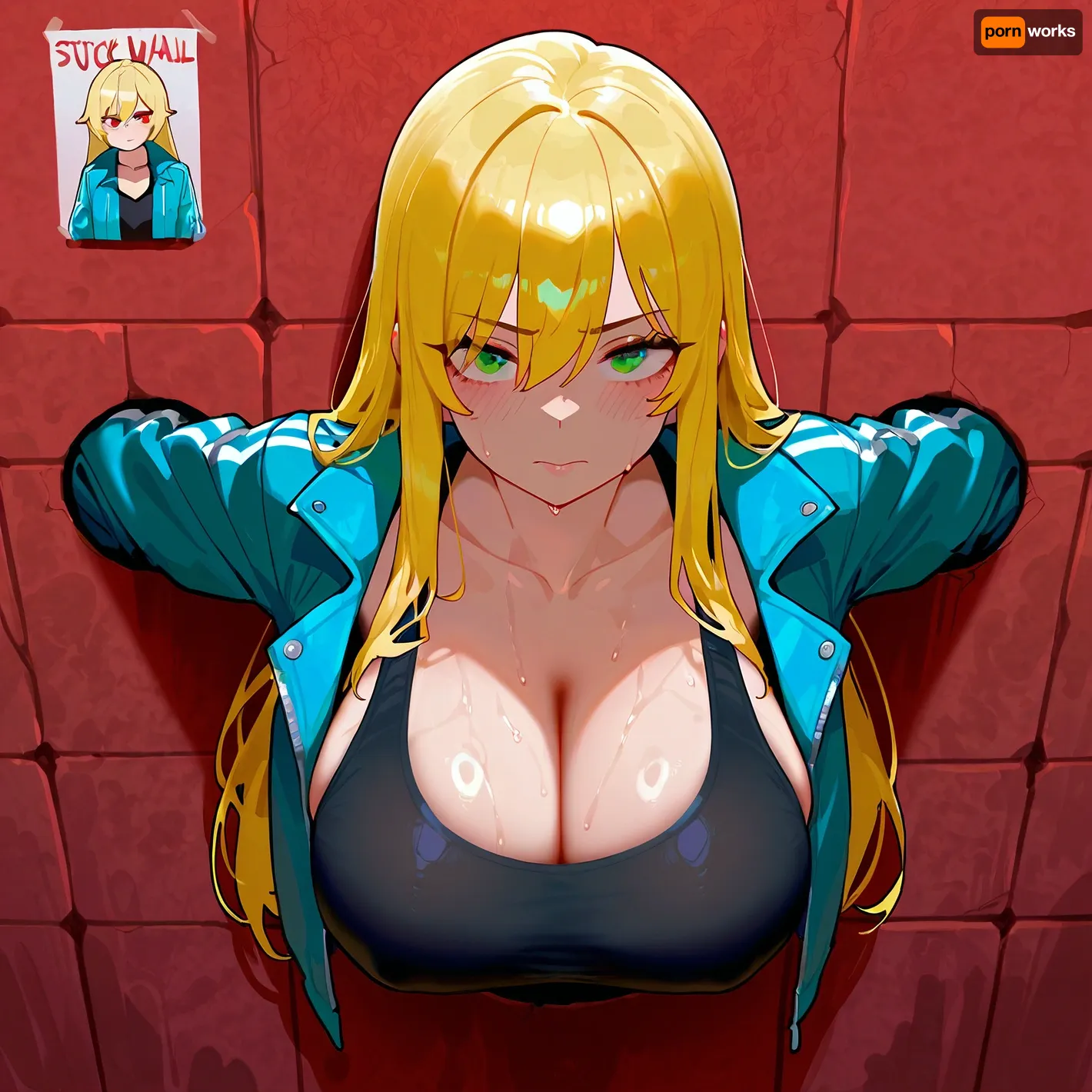 glory wall, green eyes, whore, slur, open clothes, collarbone, red eyes, solo, open jacket, 1girl, long sleeves, large breasts, looking at viewer, sweat, breasts, tank top, black tank top, long hair, blond hair, blue jacket, trapped_in_wall, stuck, in, wall