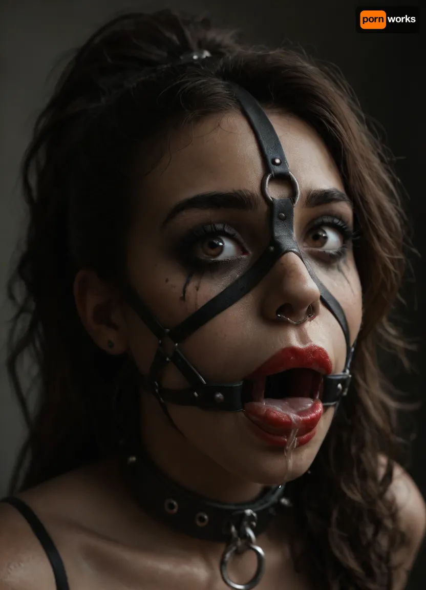 ((30 years old, Tipical italian girl, fit body, fake booobs, perfect cute face, scared, crying, curly very long brown hair in ponytail, brown eyes, light freckles, bimpo lips, skin pores, smooth skin, round ass, hips gap, oiled body)), ((heavy goth makeup, eyeshadow, eyeliner, mascara, red lipstick)), (slave collar), ((nose ring piercing, septum piercing:1.5)), (wearing a black thong), ((face harness gagged mouth:1.5)), ((drooling saliva from mouth, lot of saliva)), in a country apartment, harnessgag, <lora:add-detail-xl:1.3>, <lora:detailed_notrigger:1.2>, <lora:dark:.8>, <lora:harnessgag_xl-000003:1.3> ((30 years old, Tipical italian girl, fit body, fake booobs, perfect cute face, scared, crying, curly very long brown hair in ponytail, brown eyes, light freckles, bimpo lips, skin pores, smooth skin, round ass, hips gap, oiled body)), ((heavy goth makeup, eyeshadow, eyeliner, mascara, red lipstick)), (slave collar), ((nose ring piercing, septum piercing:1.5)), (wearing a black thong), ((face harness gagged mouth:1.5)), ((drooling saliva from mouth, lot of saliva)), in a country apartment, harnessgag, <lora:add-detail-xl:1.3>, <lora:detailed_notrigger:1.2>, <lora:dark:.8>, <lora:harnessgag_xl-000003:1.3>
