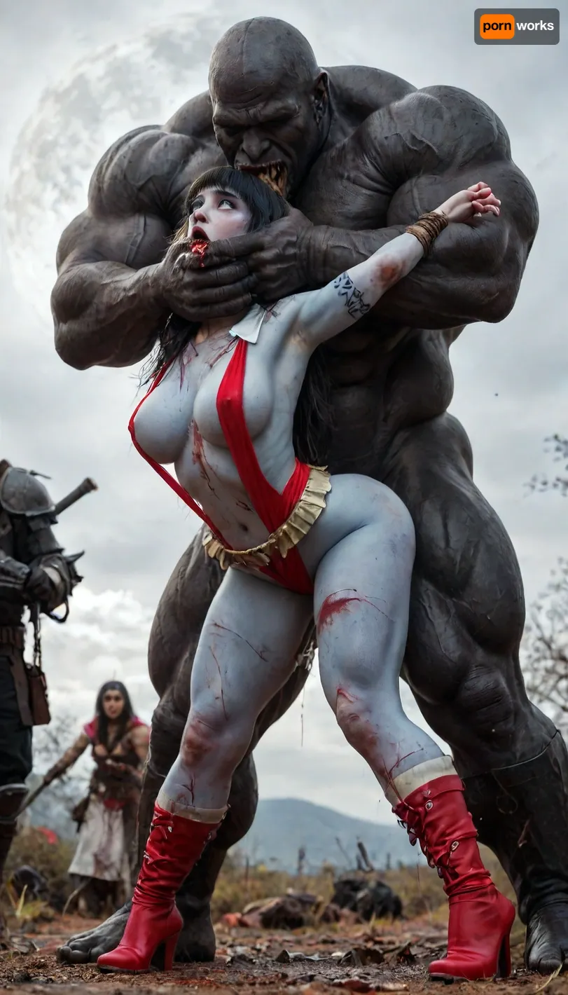 (vampirella:1.32), ((Vampirella is a tall, pale woman with a mane of raven-black hair and green eyes. Her look is that of a skimpy, red sling bathing suit barely covering her nipples and genitalia, with a golden bat emblem over the crotch. She wears an upturned white collar at her neck, long, high-heeled black boots, and a golden bracelet on one arm)), female drow elf barbarian, (blue skin:1.82), tall, angry, busty, curvy, thin waist, big boobs, big butt, slim, fit, vitiligo, strong, fur pelt armor, dungeons and dragons, purplish blue skin, black and purple hair, Dark, Elf, Warrior, Drow, tattooed, scarred, purple eyes, blue skin, amazon, giant, fur barbarian armor, bloody, blood spatter, bear, bear heart, (in a bloody filed after a battle, white full moon in the sky:1.4), (man is choking her from behind:1.2), ((hogtied, bound with large chains, crucified to a torture table, spikes through hands:1.3)), (torture:1.32), (large sharp sword in anus:1.12), cock in mouth, (brutal face fuck), Blowjob, (tears in eyes:1.5), (running makeup), (cum drips from nose:1.3), (cum drips from mouth:1.3), ultra hd, photorealistic, hyper gigantic large black cock in mouth, (((hyper gigantic large black cock in mouth:1.3))), gangbang, double anal penetration, anal spitroast, groupsex, deepthroat, (4 gigantic African black brute thug, huge trunklike arms, huge head, hyper muscular body, dressed in slave clothes:1.32), ((hogtied, bound for sex, tied up)), (((hyper gigantic large white cock in mouth:1.3))), (pulled nipples:1.2), nipple clamps, (((spitroast))), (((hyper large cock in mouth:1.3))), screaming, shocked, deep anal penetration, Uber realistic, 8k, ultra detailed, masterpiece, arched back, detailxl, 35mm photograph, film, professional, 4k, 1girl, 5 boys, hdr, photographic, ultra realistic, ultra high details, back light, (front view), (dynamic pose), best quality, incredibly lean body, anal sex, with large muscular black men, gargantuan black cocks, large hyper muscular fat old men, (double anal sex), swollen white veiny cocks, (double anal penetration), hardcore double penetration, proper physics, big white cocks, muscular white double anal gangbang, (forceful penetrations), extremely graphic, beautiful hands, defeating a woman in combat, fighting, killing, blood, winning fight, magazine cover, Realism_Quality_2xx_By_Stable_Yogi, score_9, score_8_up, score_7_up, (((very pretty face:1.3))), (((extremely ultra detailed face:1.3))), perfect fingers and hands, upper body view, (extreme size difference:1.6), (ultra realistic), (maximum quality), (high resolution), (extreme detail), (ultra realism), UHD, super high quality, highly detailed, high resolution, perfect lighting, natural lighting, (dynamic angle), (random angle), (random pose), (dynamic view), (random view), golden hour, rich details, nature-inspired color palette, <lora:LCMTurboMix_Euler_A_fix:2>, <lora:Dark_Elf_Warrior:2>, <lora:Drow:2>, <lora:zavy-brbrn-sdxl:2>