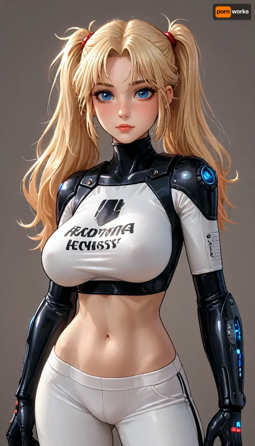 Cybergirl, blond ponytails, robotic arms,shirt and yoga pants