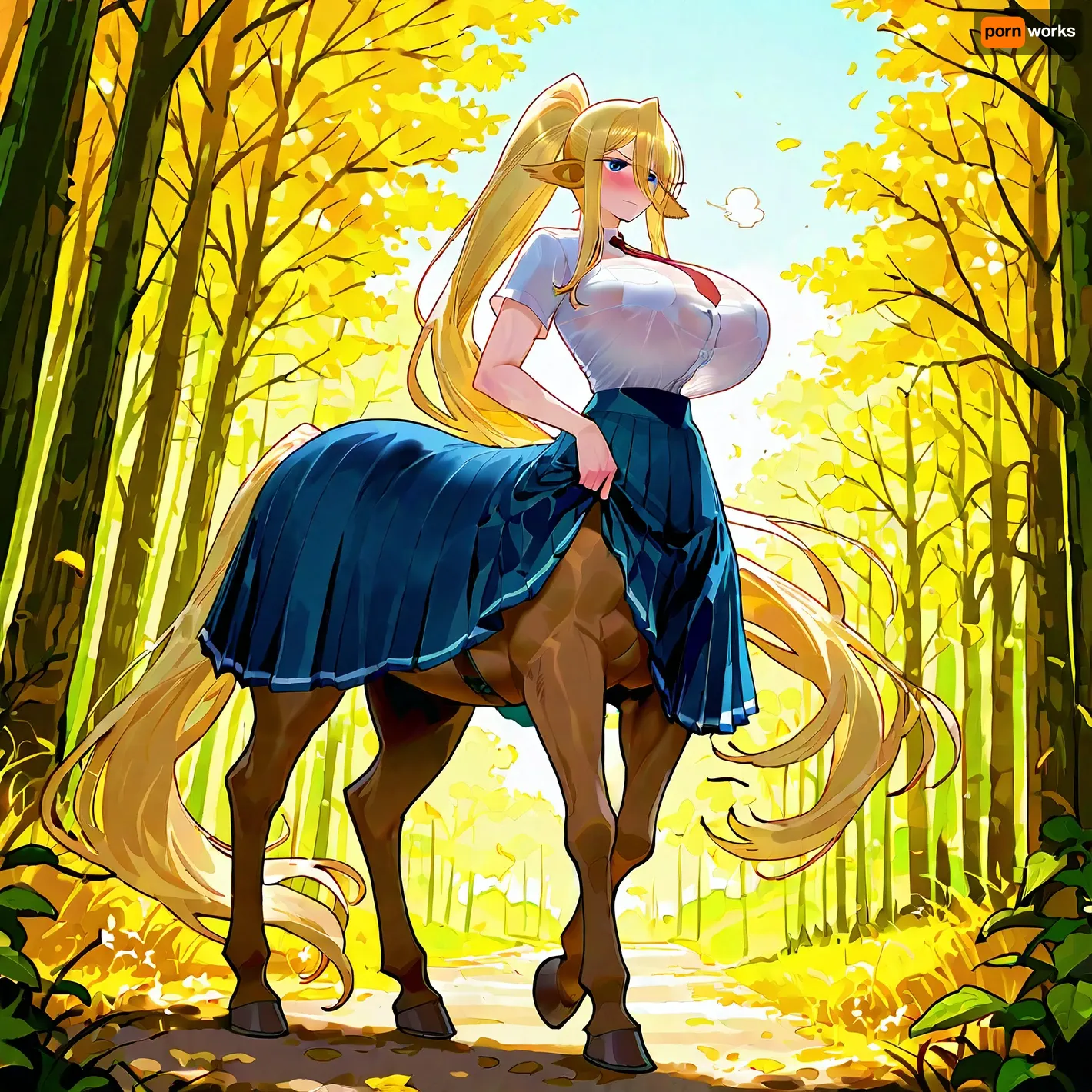Centorea Shianus, (Monster Musume), . Centaur Monster girl, extra long blonde hair, huge boobs, transparent white button up shirt, red tie. Blushing and Bashful, standing in the backyard, full body view, golden brown horse body.