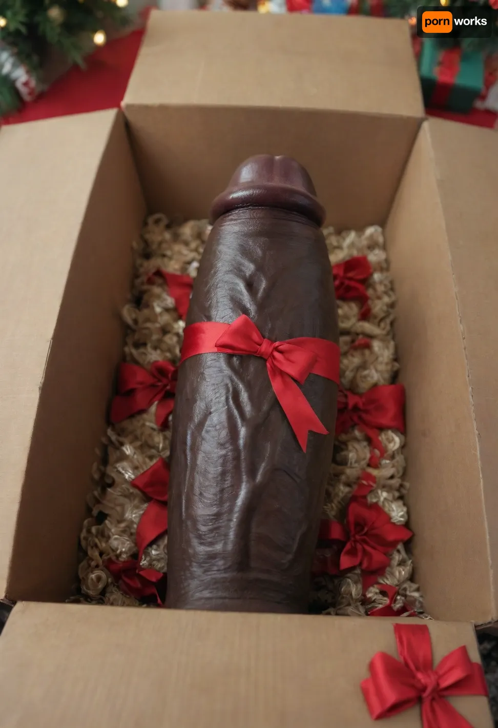 ((a huge circumcised black cock inside a gift box, (big black dick inside a gift box))), ((dick in a box)), bbc, big red bow tied around shaft