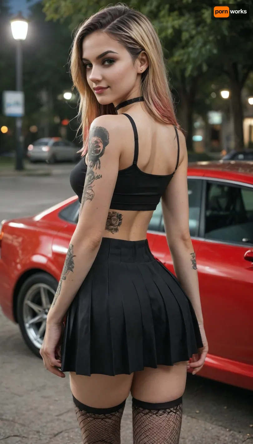 rear view, car park, looking back at the viewer, (30 year old goth, slim toned body, narrow waist, wide hips, (dyed-blonde long straightened hair), brown eyes, eye shadow, choker, smirking, (tattoos), fishnet stockings, black top, pleated black miniskirt), slutty pose, ultra-realistic, color photograph, ultra-detailed, professional photography, (dramatic lighting:1.5) rear view, car park, looking back at the viewer, (30 year old goth, slim toned body, narrow waist, wide hips, (dyed-blonde long straightened hair), brown eyes, eye shadow, choker, smirking, (tattoos), fishnet stockings, black top, pleated black miniskirt), slutty pose, ultra-realistic, color photograph, ultra-detailed, professional photography, (dramatic lighting:1.5)