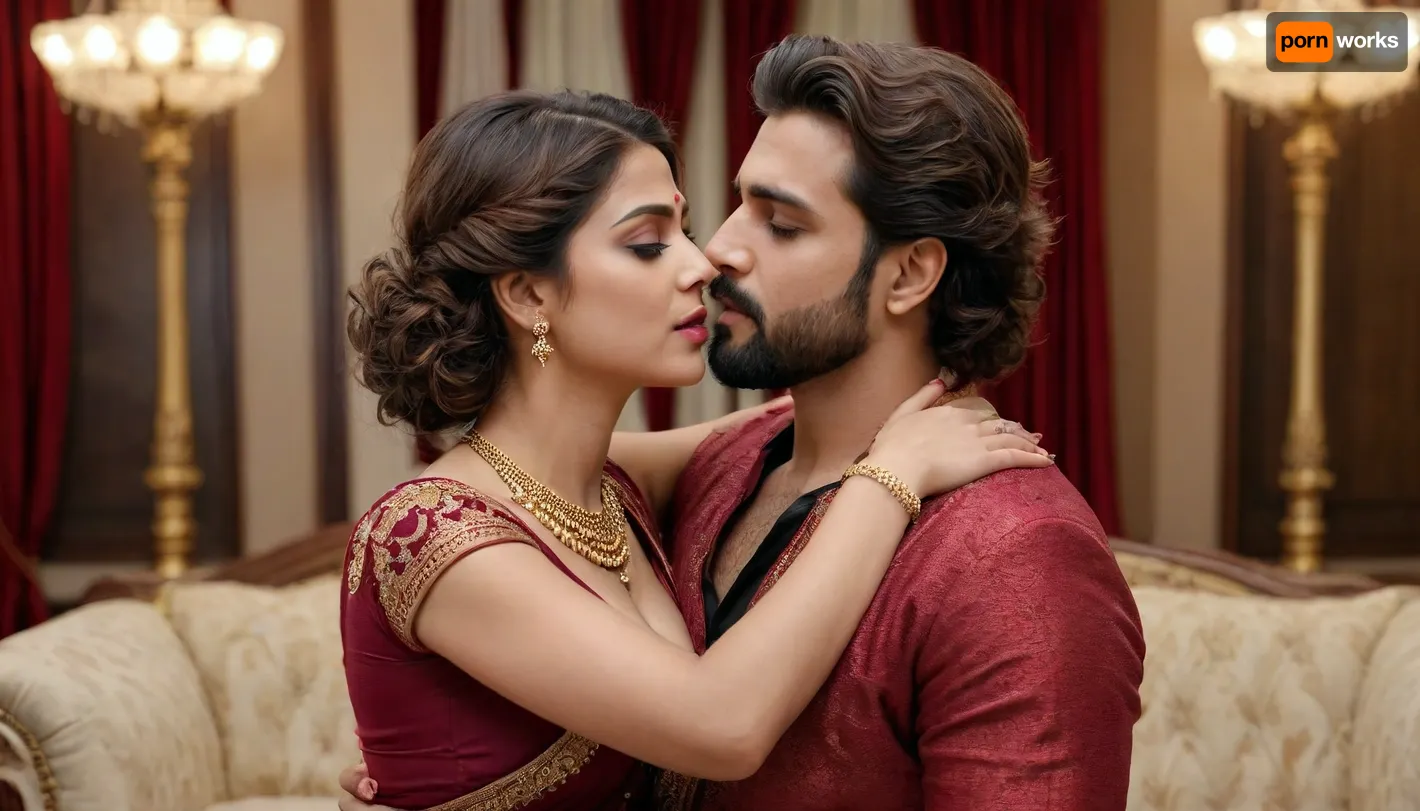 background, spacious modern elite photo room, with luxury sofa set, cream color carpfull body view of most beautiful european couple as most beautiful indian couple, DEEP CUT NECK AND BACK, MAROON color carpet, elegant interior designs, vintage lamps, romantic reunion ambience, photorealistic, vibrant colors, intricate details, 8k.et, 8k. full body view of most beautiful european couple as most beautiful indian couple, most beautiful girl in elegant bold color saree and long curly hairs, hairs tied up with hair style stylishly, necklace, big wide black eyes, full face, makeup, low cut neck, SLEEVLESS, LOW CUT BACK, girl embracing with emotion and possessive feeling, pressing face to chest of man, emotional crying with longing feeling, innocence and ecstasy, hands around man neck, man comforting her, man with stylish beard, perfect SHORT hair cut, formals, photo realistic, 4k.