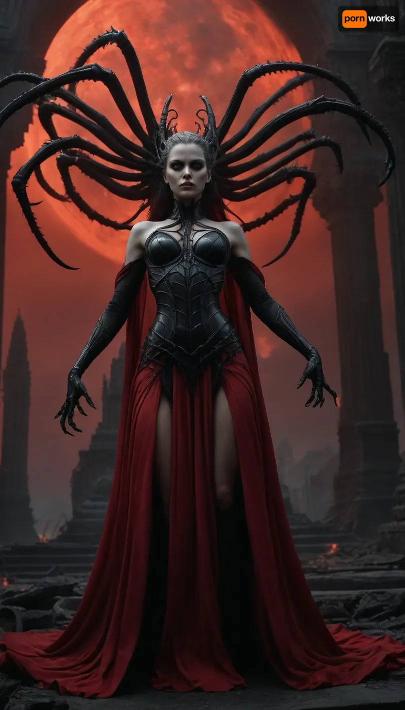 (epic, masterpiece, highres), final battle scene, dark goddess floating above the ruins, biomechanical spider limbs extend from her back, dramatic red glow behind her, black and white environment with only red as contrast, erotic and terrifying, tattered silk robes flowing, remains of web temple in background, alien planet sky, fire, mist, apocalyptic elegance, inspired by Giger, HR-fantasy hybrid, strong female power, gothic post-apocalyptic mythology