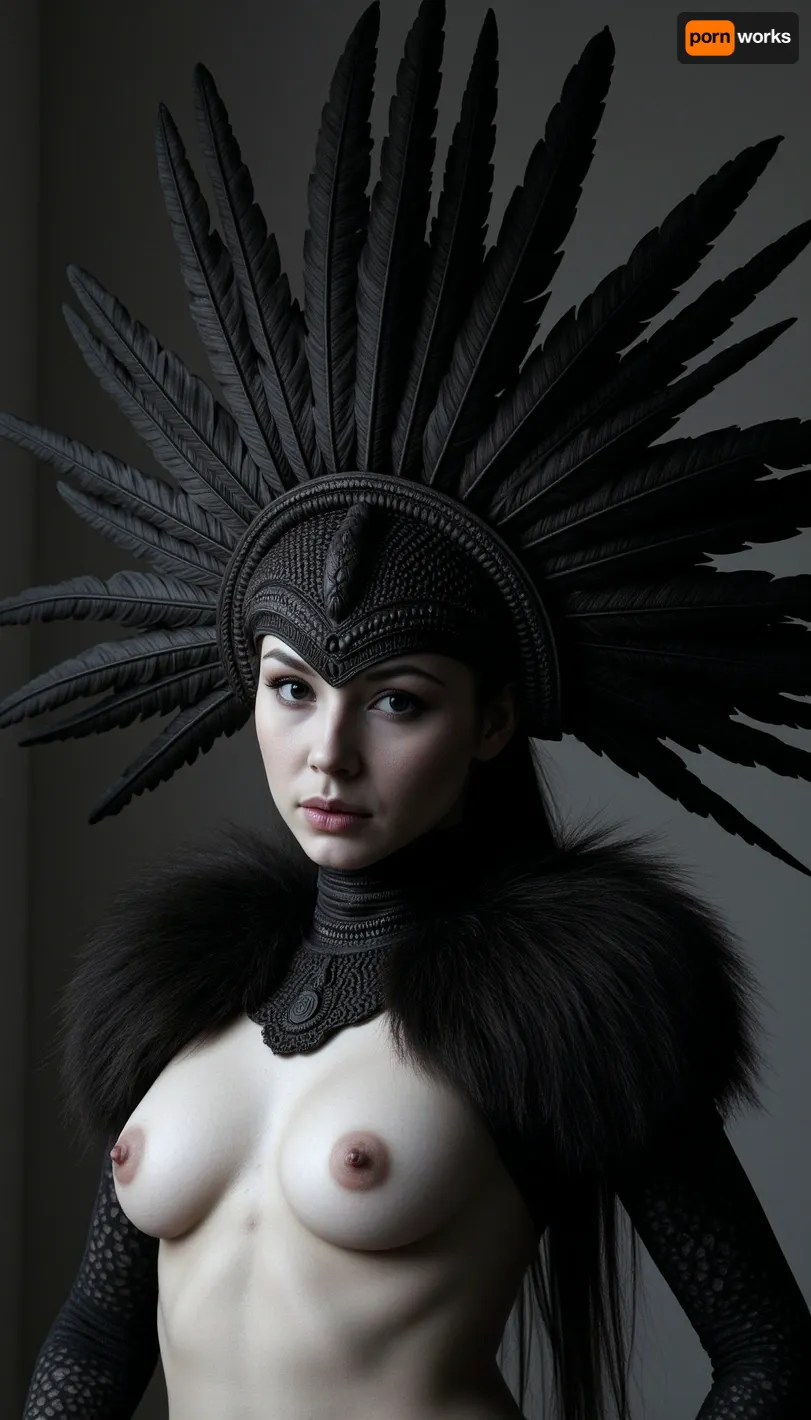 (old woman:1), detailed eyes, evil, muscular, cyber, Aztec, God. detailed large black feathered headdress, very large wide headdress with tall feathers, (black feather length:1.5), detailed shoulder length collar, looking at viewer, dark art style, side head portrait, close up, (black and white ratio:1.3)