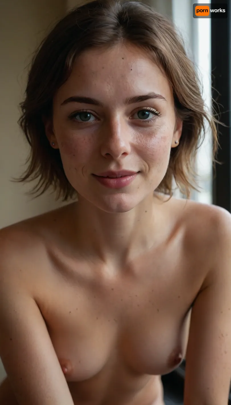 Sublime sexy innocent 28 year old French baker, perfect pure warm innocent face, big Green eyes, brown short hair, short ponytail, ray of sunlight through the window, full body, (((long distance view))), (((full body view))), (((high detailed legs))), (((high detailed fingers))), 21 year old, ((very much want have sex)), ((European British Scandinavian)), well-build body, medium tits, small lips, lots of freckles face and skin, blush on the checks and nose, (raised nasal tip, upturned button nose, upturned nose, delicate nose, nose), loving grey eyes, brown wild wet hair with sidelocks, very sexy smile