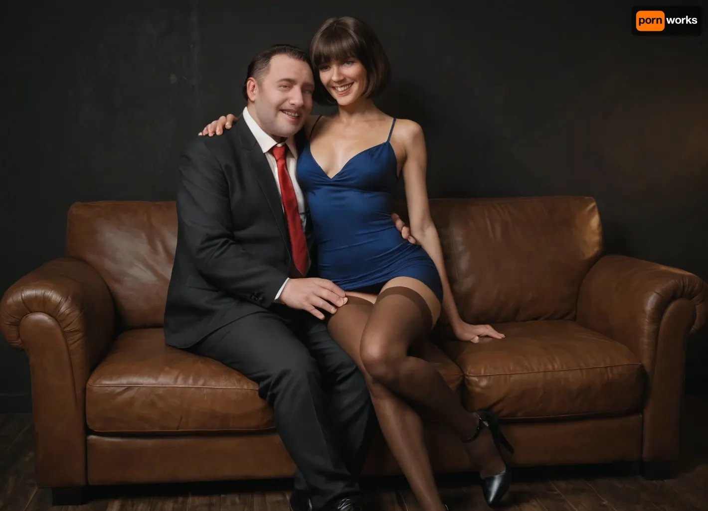 (ultra realistic, ultra detailed, best quality, realistic style, soft shadows, soft light, cinematic), (black room, brown leather sofa), man and woman on sofa, man hugs a woman, man grabs a woman, skinny 40 yo old russian brunette mature wife, (dark medium-length bob hair with bangs), (thin narrow triangular face, narrow long nose, feint small amount of freckles across nose, thin narrow lips, dark grey eyes, caucasian face type, no makeup), (short petite skinny body, (skinny:1.3)), short skinny legs, wide thigh gap, skinny flat ass, skinny hips, slightly tanned skin, no tattoos, short tight dark blue dress, (brown stockings:1.3), black high-heeled shoes, face expressions, laughing, (realistic faces:1.3), (perfect face:1.3), (perfect eyes:1.3), perfect hands, realistic detailed eyes, (realistic mature skin texture:1.3), (fat man, 50 years old wearing in black suit, blue shirt, red tie, shaved face, short dark hair)