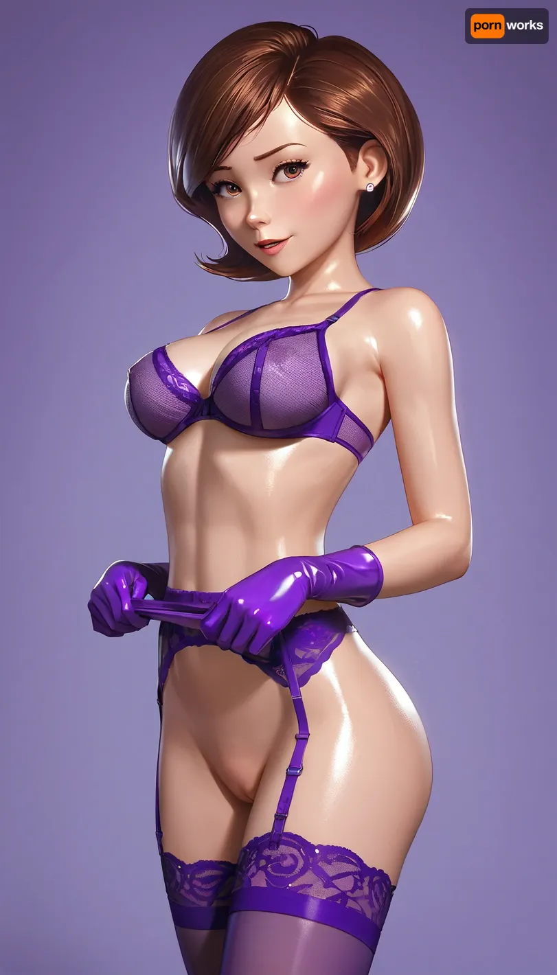 Helen Parr sex with Bob Parr from the Incredibles, nude standing, oiled up, purple silk half cup bra, purple long-sleeved silk gloves, purple silk stockings, purple silk garter belt with straps, sexy, beautiful
