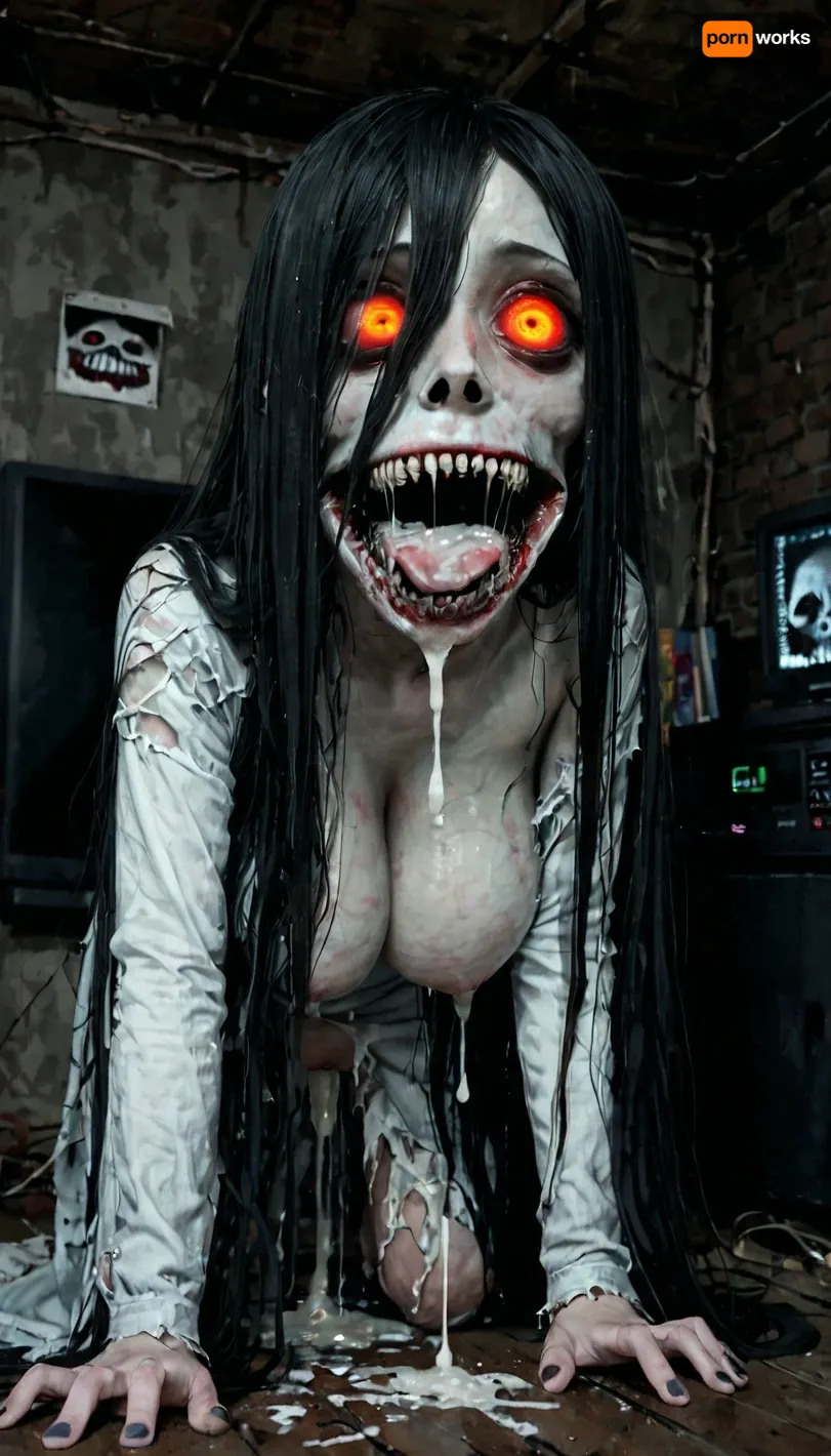 score_9, score_8_up, score_7_up, score_6_up, (animated, 2d, anime style), (((Sadako Yamamura))), 1girl, solo, long hair, black hair, very long hair, (mess hair), naked breast, torn clothes, impossible clothes, hair over eyes, torn dress, grey skin, impossible dress, yamamura sadako, hair over one eye, (((yandere, psychosis, possession, dangerous, crazy, psycho))), blush, (heavy breathing), steam, (bags under eyes), night, television, sweat, head tilt, cleavage, (massive veiny breasts, saggy), ((full body)), (night, dark room), (red glowing eyes), (((stuck in static tv screen))), glitches, lean forward, ((gothic style, dark theme, low light, cold colors, nightmare, horror)), (horror mouth wide open:1.3), excessive Saliva dripping, side view, bukkake, cum, <lora:MS_Real_XL_Bukkake:.8>, (thick white cum:1.2), cum in pussy, dripping pussy, (anal sex:1.3), (cum dripping from pussy:1.4)