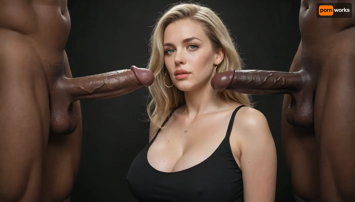 white woman, (milf:1), blonde hair, green eyes, nsfw, black spandex top, massive breasts with hard nipples under the shirt, looking suprised and in shock at a massive cock of a black african male in front of female, gigantic thick 25 inch penis, huge erection. sqeezing his testicles, black room, black background. white woman, (milf:1), blonde hair, green eyes, nsfw, black spandex top, massive breasts with hard nipples under the shirt, looking suprised and in shock at a massive cock of a black african male in front of female, gigantic thick 25 inch penis, huge erection. sqeezing his testicles, black room, black background.