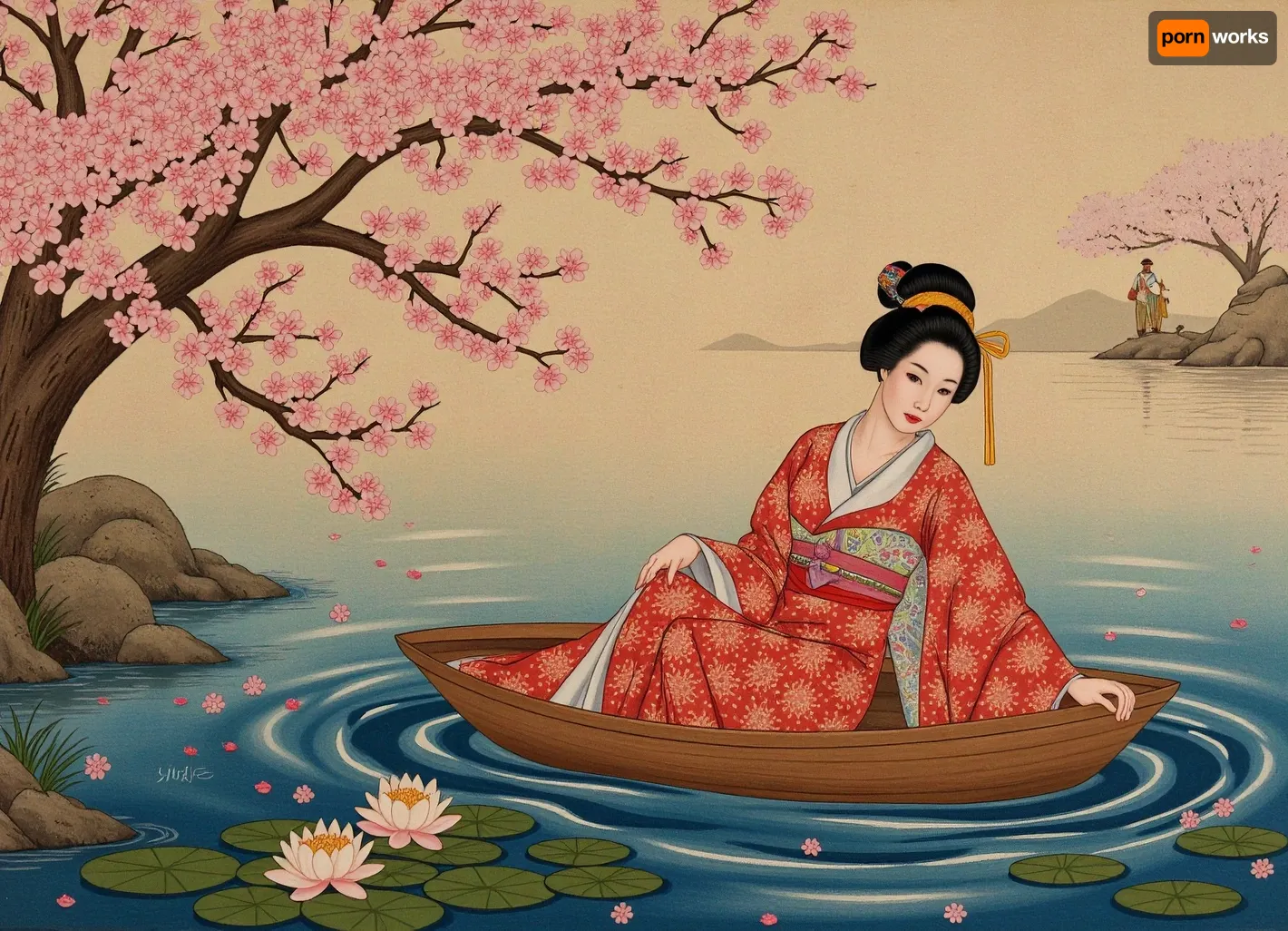 A 17th century, (wooden panel:1.8), (master painting), (high quality:1.2), (detailed:1.1), (Japanese aesthetics), (deep tones), (rich colors), (refined:1.1), geisha woman in boat, traditional, (kimono:1.1), with, (coral cherry blossoms:1.1), and, (red obi:1.1), (black hair:1.2), (traditional hairstyle:1.1), (spring pond), (floating sakura petals), (water lilies), (blossoming sakura trees:1.1), (blue water:1.2), (radiant light), (realistic water reflections), (ukiyo-e art style), (Japanese woodblock print), (precise outline), (smooth lighting)