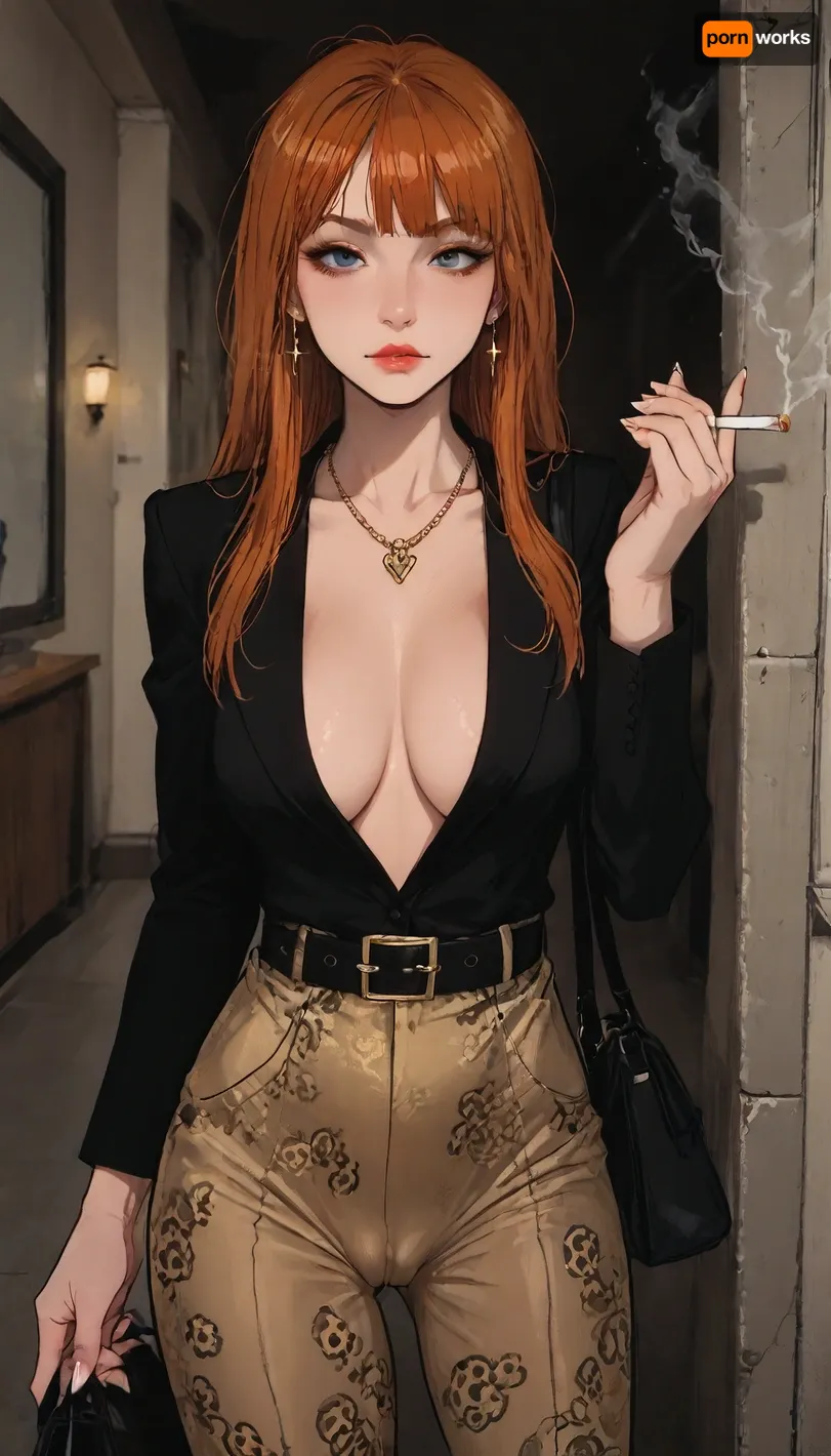 ((Melkor mancin mix markgavatino style)), incase style, masterpiece, (1woman, 8k resolution, ultra-detailed), nasty bitch Petra mature milf 50years, cheekbones, ((hand smoking cigarette)), full dressed, super waist, tall slender, hips side, handbag plasticbag, ((long bangs slickened ginger bangs)), necklace, (makeup modern blue eyeliner), (leopard pattern legins spandex, (((cameltoe)), puffy pussylips fingering)), shimmering brown iris eyes, (big black belt), plateau-heel, ultra long legs, lips cool smile, lipstick glossy, beautiful drawn fingernails, (tatoos ink body-artwork:1.2), arms teasing curves, pushup lace, (sagging breast dressed sagging cleavage:1.2), (many neon bright-colours led writings), ratatatat74, jtcstyle, SamDoesArts, <lora:LCMTurboMix_Euler_A_fix:.6>, <lora:ratatatat74-000050:1.1>, <lora:mk_Bp Anime_xl:1>, <lora:加藤彩style:1.8>, <lora:SDXLSamDoesArts:1.7>
