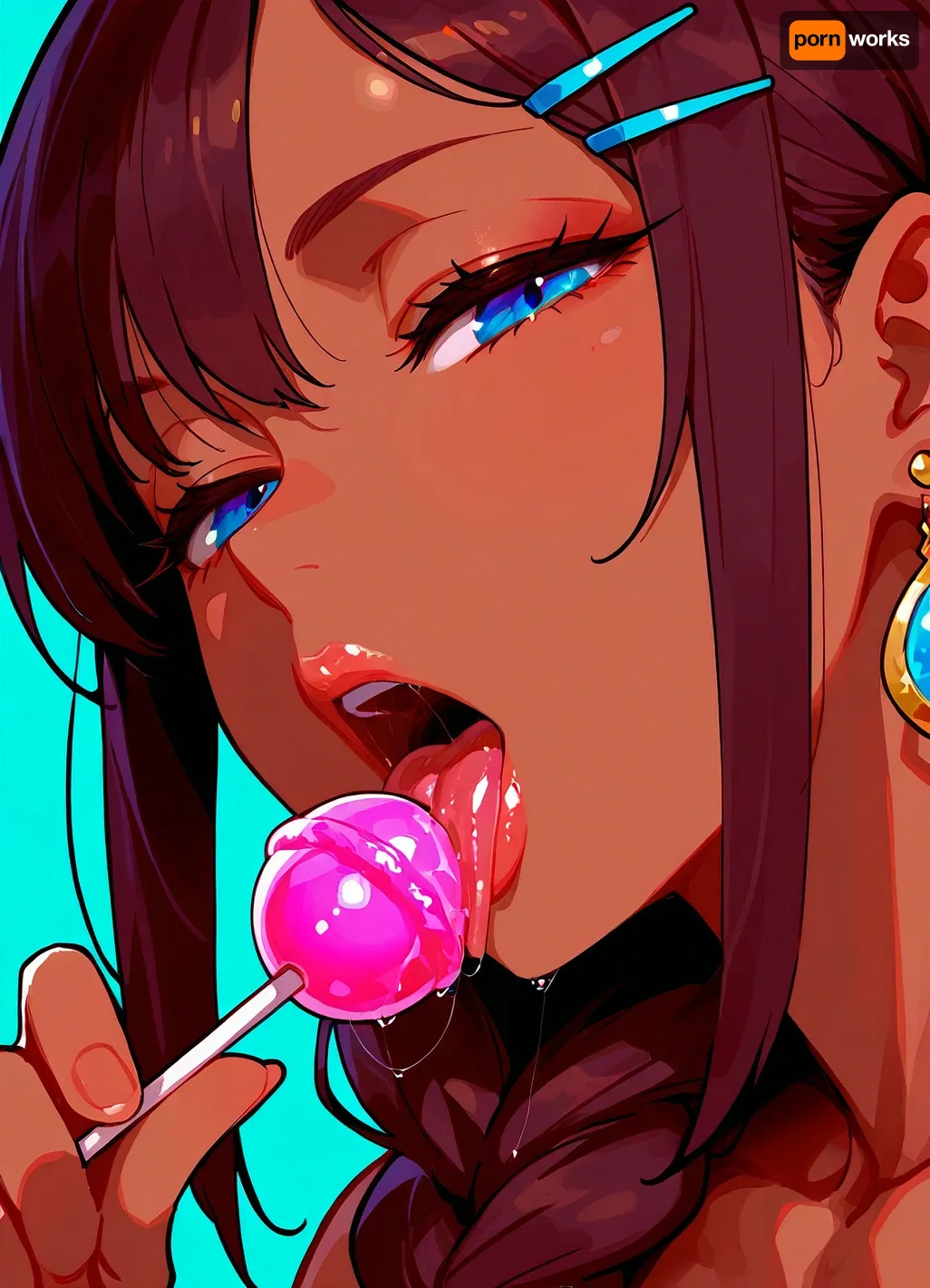1girl, blue eyes, brown hair, hairclip, sidelocks tied back, one braid, dark-skinned, earrings, close-up, solo, tongue, food, saliva, open mouth, candy, abstract background, large lollipop, tongue out, aqua background, lips, hand up, holding, looking at viewer, licking, seductive, half-closed eyes, <lora:SDXL Detail:.8>