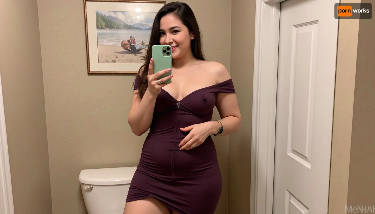 a fully nude, (entire body), of a Hispanic woman that is not muscular, 5'9" in height, and about 180lbs in weight, XL size in clothing, 34" waist, 42" hips, she has medium-sized teardrop breasts, slightly saggy, (34C breast cup), noticeable belly, and measurements must reflect on her body shape. She is taking a selfie in a bathroom mirror using a green iPhone. She is wearing a form-fitting, off-shoulder, dark purple dress that accentuates her figure. Her long, dark hair cascades down her shoulders. She is smiling and has a ring on her left hand. She is also wearing a smartwatch on her left wrist. The bathroom has beige walls with a subtle pattern, a white toilet, and a framed picture on the wall., h41ry, puffy, nipples, dark, ghost, wide, Curvy, body