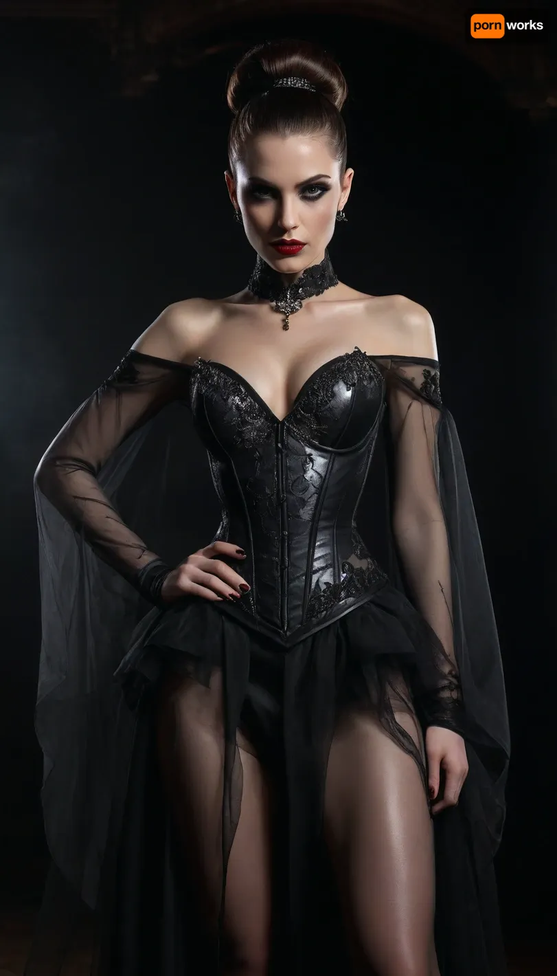 (Location is dungeon, squalor, damp), ultra realistic dark, ((sadistic_dominatrix:1.2)), gothic fantasy, sharp focus, extreme detail, 8K, UHD, Gothic, Glam, (((Dominatrix))), Seductress, Explicit, full view, 35yo dark gothic seductress, extreme elegance, dominant glamorous presence, pronounced hourglass figure, extreme waist cinch, wide hips, very long legs emphasized, confident sensual stance, facing forward, dark gothic fantasy couture gown, NOT bridal, NOT wedding dress, NOT bride, off shoulder sweetheart neckline, very deep plunging neckline, structured corset bodice, visible boning, extreme sculpting emphasizing cleavage, curves, and waist, dark silver gown, metallic silver and graphite tones, cold silver palette, sheer ultra light translucent chiffon and tulle, airy see through layers revealing legs and full body silhouette, fabric is weightless, ethereal, drifting as if suspended in air, flowing independently of the body, latex illusion sheen on bodice and panels, high gloss reflective surface, liquid light reflections, mirror highlights contrasting with soft fabric, ultra high slit illusion created by transparency and fabric separation, sheer layers, ornate dark silver gothic embroidery, baroque floral vine patterns, luxury fantasy detailing, silver sparkles and cold luminous highlights embedded in fabric, long floating sheer sleeves, detached draped sleeves, ultra light translucent fabric billowing outward, high heels clearly visible through transparent skirt, HAIR IS A SLEEK HIGH PONYTAIL UPDO, hair pulled tightly upward, smooth polished crown, NO loose hair, NO waves, NO curls, NO hair down, high ponytail secured at the crown, long straight tail down the back, glossy smooth texture, sharp clean hairline, bangs framing the face, sleek high ponytail updo, pulled tight, smooth crown, straight tail, extreme editorial glam makeup, sharp sculpted brows, intense smoky eyes with deep plum and black gradient, dramatic cut crease, thick sharp winged eyeliner, ultra long false lashes, strong metallic cheek highlight with glassy reflective sheen, heavy contour, razor sharp cheekbones, blood red lips, flawless porcelain skin, moody gothic atmosphere, low key cinematic lighting emphasizing shine, transparency, latex sheen, floating fabric