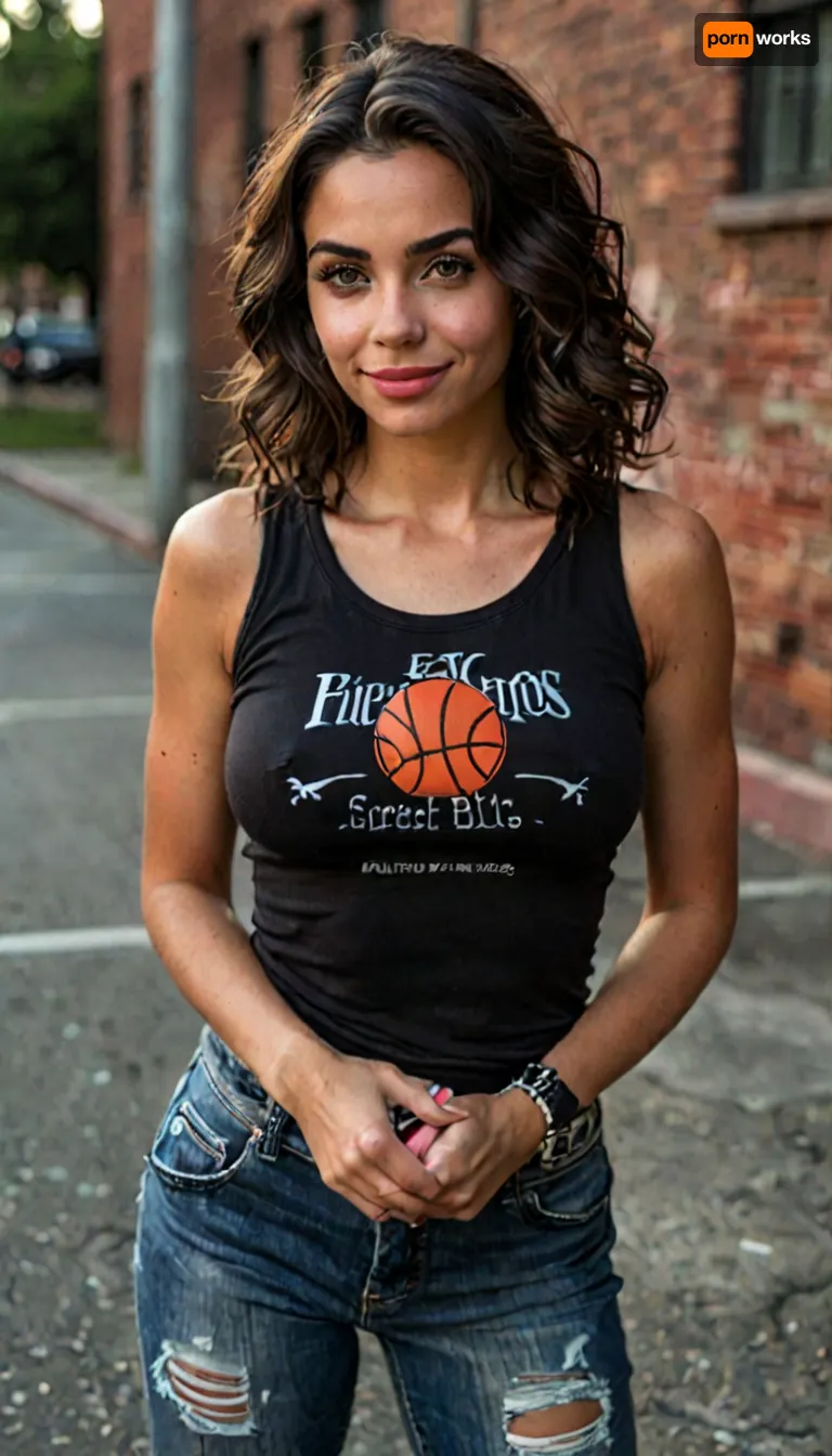 ASSIGNMENT, Create an award-winning image of a stunning Hispanic coed standing in an urban outdoor basketball court. BREAK CLOTHING, a sleeveless black shirt, black_pants, black_denim_pants, ripped_pants, high tops, bangles jewelry. BREAK BODY, gorgeous, busty, athletic, slender, Latina, Hispanic, dark skin, 22 years old, sexy, medium_breasts, C_cup, natural_breasts, hanging_breasts, detailed natural breasts, wide nipples, perfect_ass, detailed realistic skin with pores and hair follicles, perfect hands, handslora. BREAK FACE, narrow, dark complexion, angular_features, striking_eyebrows, long_eyelashes, heavy_makeup, mascara, eyeliner, bold blue eye_shadow, brown_eyes, big_eyes, expressive_eyes, looking_at_viewer, detailed_face, perfect_teeth, smile, lipstick, full lips, moist_lips. BREAK HAIR, gorgeous jet_black_hair, (hair in tight ringlets), dark dark hair, hair cupping face, bangs, detailed hair, BREAK LOCATION, outdoors, urban outdoor basketball court, basketball goal visible, chain link fence, worn asphalt, faded basketball court paint, graffiti, brick wall with lots of colorful graffiti, interesting_background, perfect lighting, perfect shadows, BREAK POSE, standing, view from thighs up, interesting angle. BREAK AESTHETIC, score_9, score_8_up, score_7_up, solo, realistic, 8K, hyper realistic, safe for work, sexy as hell, BREAK TEMPLATES, but, braless, Wearing, clothes, that, make, sense, with, Braless>, <lora:add-detail-xl:2>, <lora:style_lora_realis:2>, <lora:BUT_SDXL_SHS:.3>, <lora:bralessSDXL_v1_00022:.8>