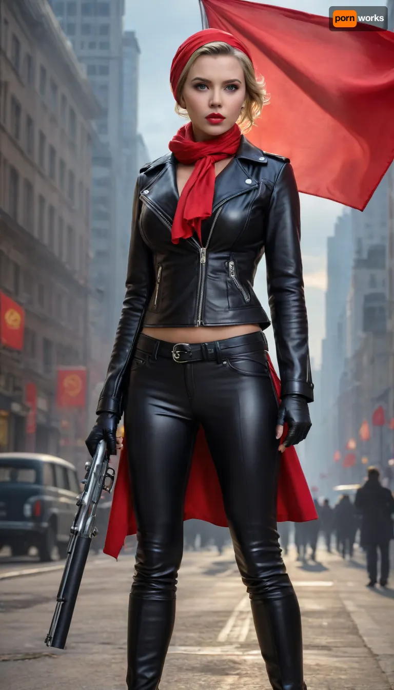 In the style of Victor Zyryanov pin-up Hajime Sorayama, Vasareli Daineko, Kondinsky, Lisa Frank, Scarlett Johansson. The October Revolution of 1917 komisar. Black leather jacket, red headscarf. In full growth. A revolver in one hand, a red banner in the other, realistic, high detail, bright lighting, professional photo In the style of Victor Zyryanov pin-up Hajime Sorayama, Vasareli Daineko, Kondinsky, Lisa Frank, Scarlett Johansson. The October Revolution of 1917 komisar. Black leather jacket, red headscarf. In full growth. A revolver in one hand, a red banner in the other, realistic, high detail, bright lighting, professional photo