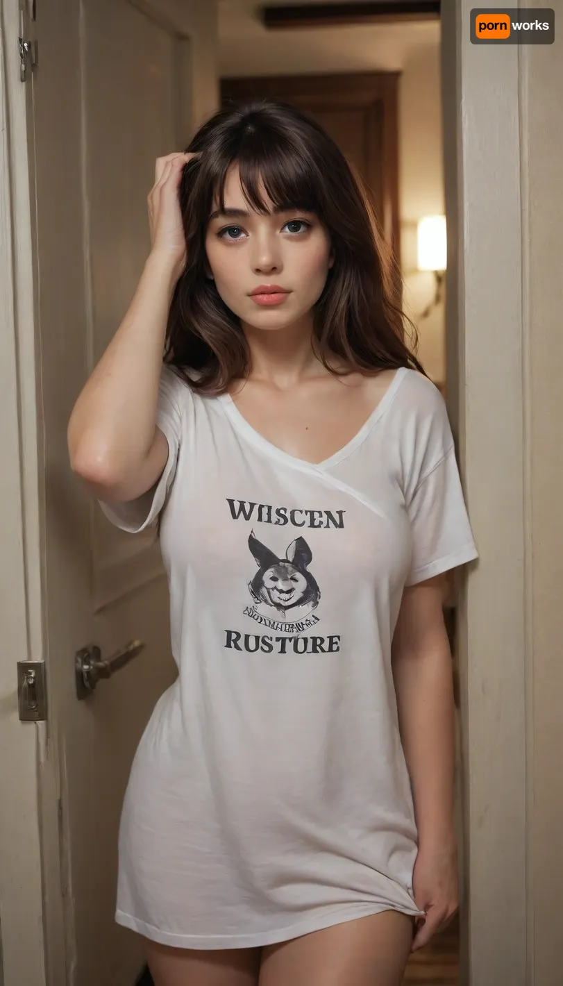 Masterpiece, Real, Realistic, Realism, REIQ, 8kHD, DSLR, Best photography, Night, Dark, (low-light), dim, worst-light, blur, oof, backlight. solo European Girl, Chinese, sleepy girl, open door, standing by the doorway, dark corridor, messey hair, (hand in hair), touching her head, (Detail face), pretty girl, adorable face, (NEW face), (just wake up vibe), long bangs, long fringes, frills, untidy hair, large t-shirt, V-neck t-shirt, shirtpull, translucent, body silohette, (one shoulder), expose cleavage, (large_breasts), thighhigh, Action, opening door. Half open eyes, no makeup, (Perfect body anatomy) Masterpiece, Real, Realistic, Realism, REIQ, 8kHD, DSLR, Best photography, Night, Dark, (low-light), dim, worst-light, blur, oof, backlight. solo European Girl, Chinese, sleepy girl, open door, standing by the doorway, dark corridor, messey hair, (hand in hair), touching her head, (Detail face), pretty girl, adorable face, (NEW face), (just wake up vibe), long bangs, long fringes, frills, untidy hair, large t-shirt, V-neck t-shirt, shirtpull, translucent, body silohette, (one shoulder), expose cleavage, (large_breasts), thighhigh, Action, opening door. Half open eyes, no makeup, (Perfect body anatomy)