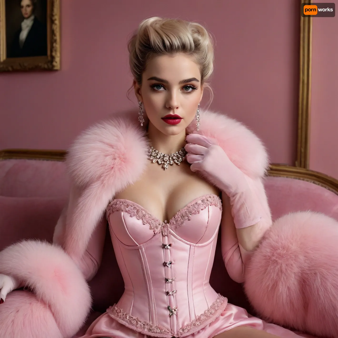Pink Power, A Striking Portrait of Style and Confidence In a recent photo making waves, a woman commands the center of attention, embodying a unique blend of high fashion and bold confidence. The scene is set against a backdrop of muted elegance, with a patterned sofa and glimpses of interior decor that suggest a modern, yet comfortable living space. The subject of the image is a woman with fair skin, her hair styled in an updo, revealing a glimpse of her dark roots. Her facial features are striking, with full red lips, a well-defined nose, and piercing eyes accentuated by dark eyeliner and makeup that highlight her cheekbones. Her expression is one of self-assured poise, as she looks directly at the camera with determination. Her outfit is a daring display of pastel pink, featuring a corset that cinches at the waist and is trimmed with fluffy fur. Matching fur accents appear around her neck, on the cuffs of her gloves, and adorning her footwear, creating a cohesive and eye-catching ensemble. The gloves themselves are a light pink, extending to her elbows, while the fur-trimmed heels add height and complete the look. The atmosphere of the photo is one of high fashion and artistic expression. The choice of color, the texture of the fur, and the woman's pose all contribute to a sense of luxury and boldness. It's a statement piece that challenges conventional style norms and celebrates individuality.
