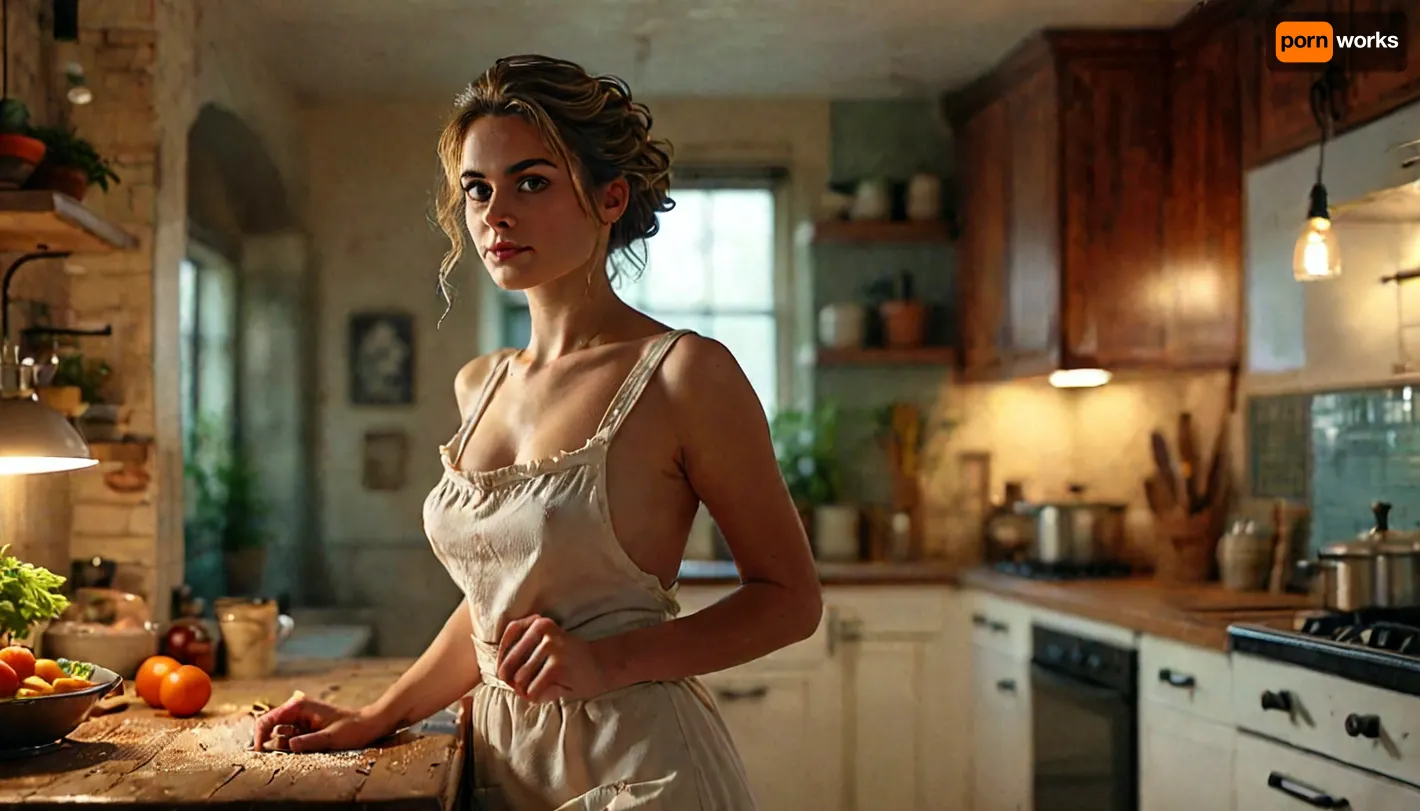 The setting is a modern high-end home kitchen decked out so many luxury features it could appear in a magazine feature. On one side of the scene is a stunningly beautiful and sexy housewife wearing only an apron. She is naked underneath. She has luminous eyes, long eyelashes, professional makeup, professionally styled hair in a French updo, a welcoming smile, medium natural breasts, and enormous areolae with big puffy nipples pressing against her apron, ((Pokies)), . Eye contact. Make this composition highly detailed, in HDR, 4K resolution, hyperrealistic, with cinematic lighting for a professional and balanced finish., braless, Wearing, clothes, that, make, sense, with, Braless>, but, <lora:MJ52:2>, <lora:add-detail-xl:2>, <lora:bralessSDXL_v1_00022:2>, <lora:BUT_SDXL_SHS:.5>, longnips, <lora:longnipsxl:.8> Create a wide UHD 8K cinematic scene with a vibrant atmosphere.