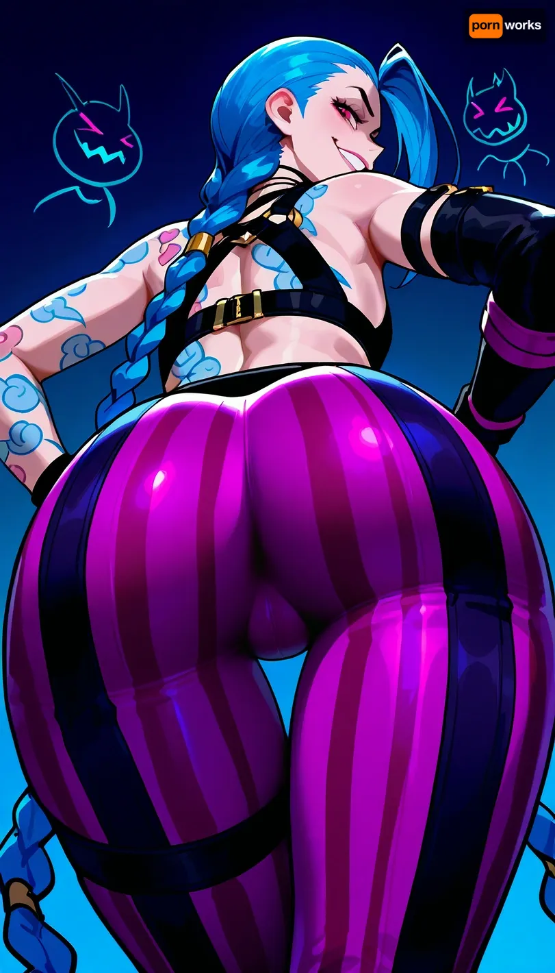 sk_comic, (Arcane style, style of Arcane, style of League of Legends:.8), (Jinx:1.4), long blue hair, braided hair, low angle view, from behind, looking back, sexy pose, thigh gap, tight outfit, seduction, intimate, sensual, intense sexual tension, crazed smug grin