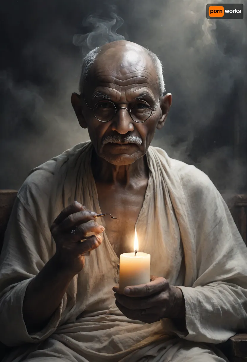 Monochrome, portrait of Mahatma Gandhi at 80 years of age, (perfect rendering of Mahatma Gandhi:1.8), very old, wrinkled face, friendly, realistic skin, aged face, detailed old, (perfect hands:1.7), (wrinkled hand lights a perfectly Hhnd grenade with a candle, flame from the candle illuminates his face:1.5), smoking weed, cannabis, smoking joint, Black, and, white, art, black, shading, charcoal, toned, brutal, dark, b/w, color, scheme, cloudy, smoke, atmospheric, clouds, fog, <lora:Black and white art.V1:1.2>, <lora:Cloudy_Style:.5>
