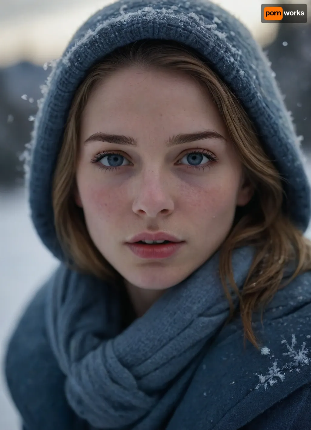 A close-up cinematic portrait of a young woman standing in the snow, her face partially covered in frost and delicate snowflakes. Cold blue tones dominate the scene, creating a moody winter atmosphere. Her expressive eyes reflect quiet emotion and resilience, with soft light highlighting her lips and the texture of frozen flakes on her skin. The depth of field is shallow, blurring the background into cool blue hues. Hyper-realistic details, 8K resolution, dramatic lighting, bokeh snow particles, filmic color grading, photography by Dan Winters, Nikon Z9, 85mm f/1.4 lens., <lora:Hegre-Nude_woman-000001:.8>