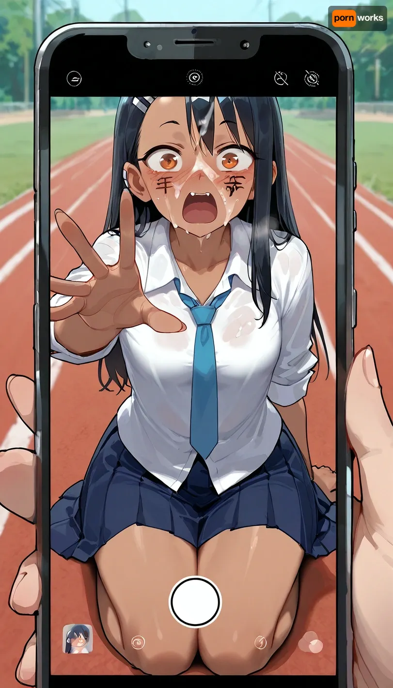 Hayase Nagatoro, small breasts, Look a viewer, shocked, face covered cum, raising straight hand to block the viewer, blocking the view, facial cum, Kneeling, outdoor, Model, fully clothed, in phone screen, face writing
