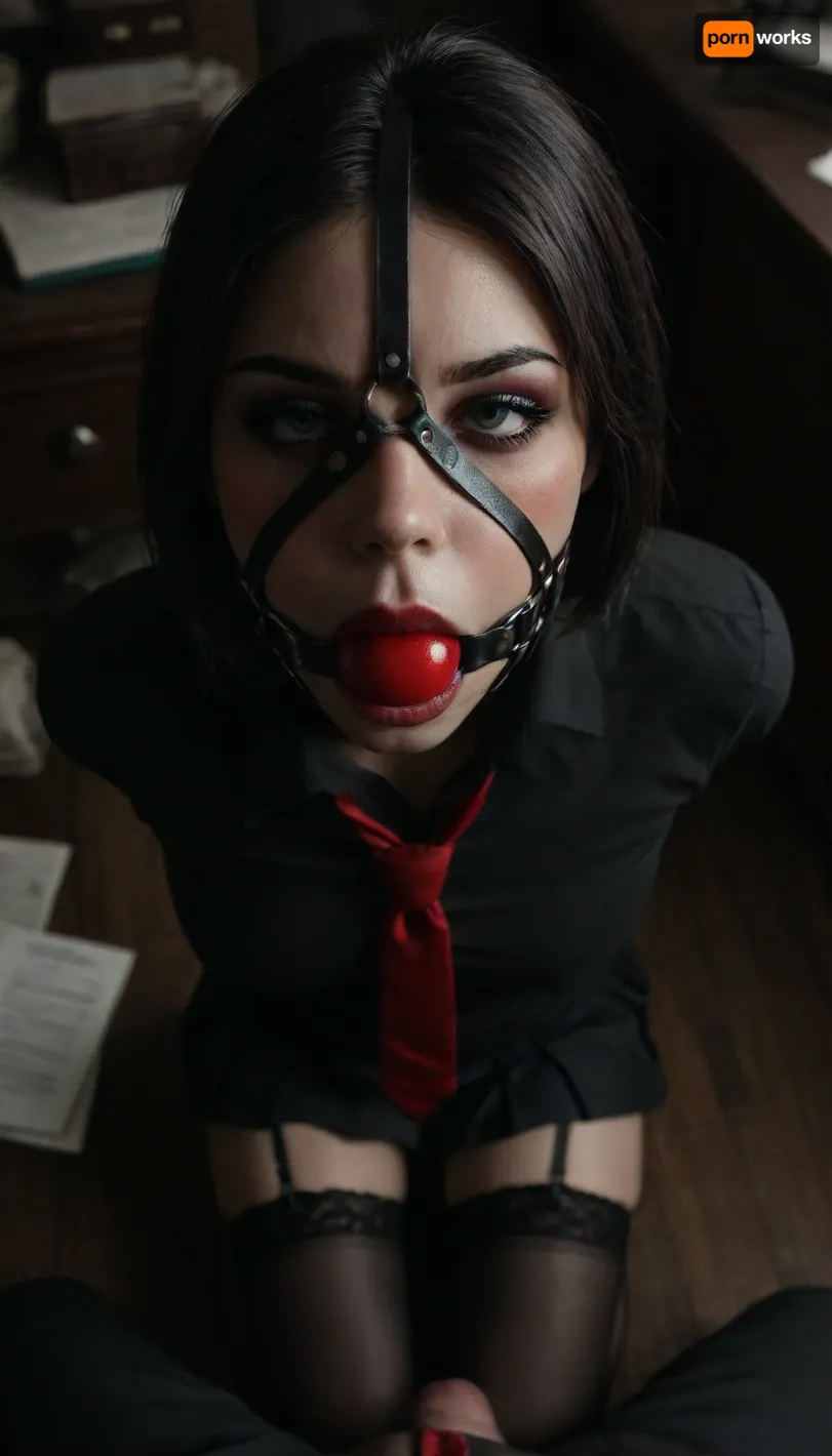 pov, (30 years old, green eyes, bob cut black hair, orgasm, pale skin, light skin, skin pores, tonic legs, muscle long legs), ((slut makeup, eyeliner, eyeshadow, dark glossy lipstick, blush)), ((red necktie)), ((black suit, white Open shirt, pleated skirt, lace blace thong)), ((stockings, garter, hairband)), (platform highels heels), ((slave collar)), ((face harness gagged mouth:1.5)), ((hands cuffed behind back)), ((office)), harnessgag, <lora:add-detail-xl:.8>, <lora:detailed_notrigger:.8>, <lora:dark:.6>, <lora:harnessgag_xl-000003:1.2>, braless, Wearing, clothes, that, make, sense, with, Braless>, <lora:bralessSDXL_v1_00022:.8> pov, (30 years old, green eyes, bob cut black hair, orgasm, pale skin, light skin, skin pores, tonic legs, muscle long legs), ((slut makeup, eyeliner, eyeshadow, dark glossy lipstick, blush)), ((red necktie)), ((black suit, white Open shirt, pleated skirt, lace blace thong)), ((stockings, garter, hairband)), (platform highels heels), ((slave collar)), ((face harness gagged mouth:1.5)), ((hands cuffed behind back)), ((office)), harnessgag, <lora:add-detail-xl:.8>, <lora:detailed_notrigger:.8>, <lora:dark:.6>, <lora:harnessgag_xl-000003:1.2>, braless, Wearing, clothes, that, make, sense, with, Braless>, <lora:bralessSDXL_v1_00022:.8>