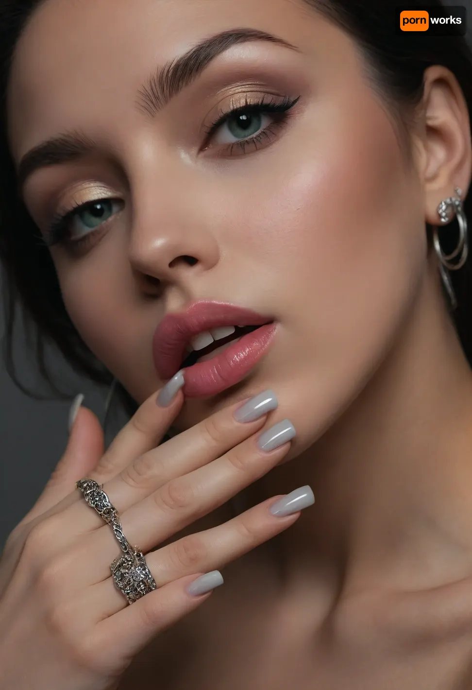 ((2 females:1.3)), (((lots of silver jewelry:1.8))), (((she wear lots of very detailed silver rings in every finger:1.9))), (perfect slutty manicured very long polish nails:1.9), ((neck silver rings:1.5)), ((silver bracelet:1.4)), perfect skin, lusty face, horny, ((((Huge cum flowing from luscious lips:1.6)))), (((cock head in lips))), bright teal eyes, female is holding huge black penis with her hands, ((huge cumshots:1.1)), (hoop earrings:1.2), (natural lips gloss:1.5), ((semen flowing from penis)), blushing, (long black hair:1.1), blush, attractive face, young beautiful girl, (tan skin:.5), flat chest, (detail very large nipple:1), lean body, Hinata waist, exposed breasts, dark teal gradient background, hdr, photographic, ultra realistic, anatomically correct, ultra high details, looking at viewer, dynamic pose, side view, best quality, ultra-detailed, masterpiece, finely detail, highres, 8k wallpaper, intricate, highly detailed, insanely detailed, best lighting, perfect illumination, (best illumination), (best shadow, best shadows), ((ultra-detailed)), (intricate details:1.1), professional photography, photo-realism, award winning photography, dslr, hyperrealistic, 35 mm, (Fujifilm XT3, analog style, professional DSLR photo, film grain:.8), 8k high definition, Great Composition, highly complex, (intricate detail:1.2), Ensure ultra-high-detail, photorealism, and crystal clear 32k resolution for a true masterpiece, hdri light, realistic lighting, ultra high resolution, clear focus, depth of field, 32k, 30 mm lens, 1/250 s, f/2.8, ISO 300, UHD 8K, high resolution face, perfect anatomic body, extremely beautiful face, (interracial:1.3), thick long black cock, (((detail full length giant black swolen thick very long cock reaches female lips))), colossal long dick, very horny expression, black lace stockings, slutty heels, wide eyes, oral cream pie, swollen black veiny cock, proper physics, proper anatomy, eyes closed, (ultra, HD, quality, details), (green eyes)