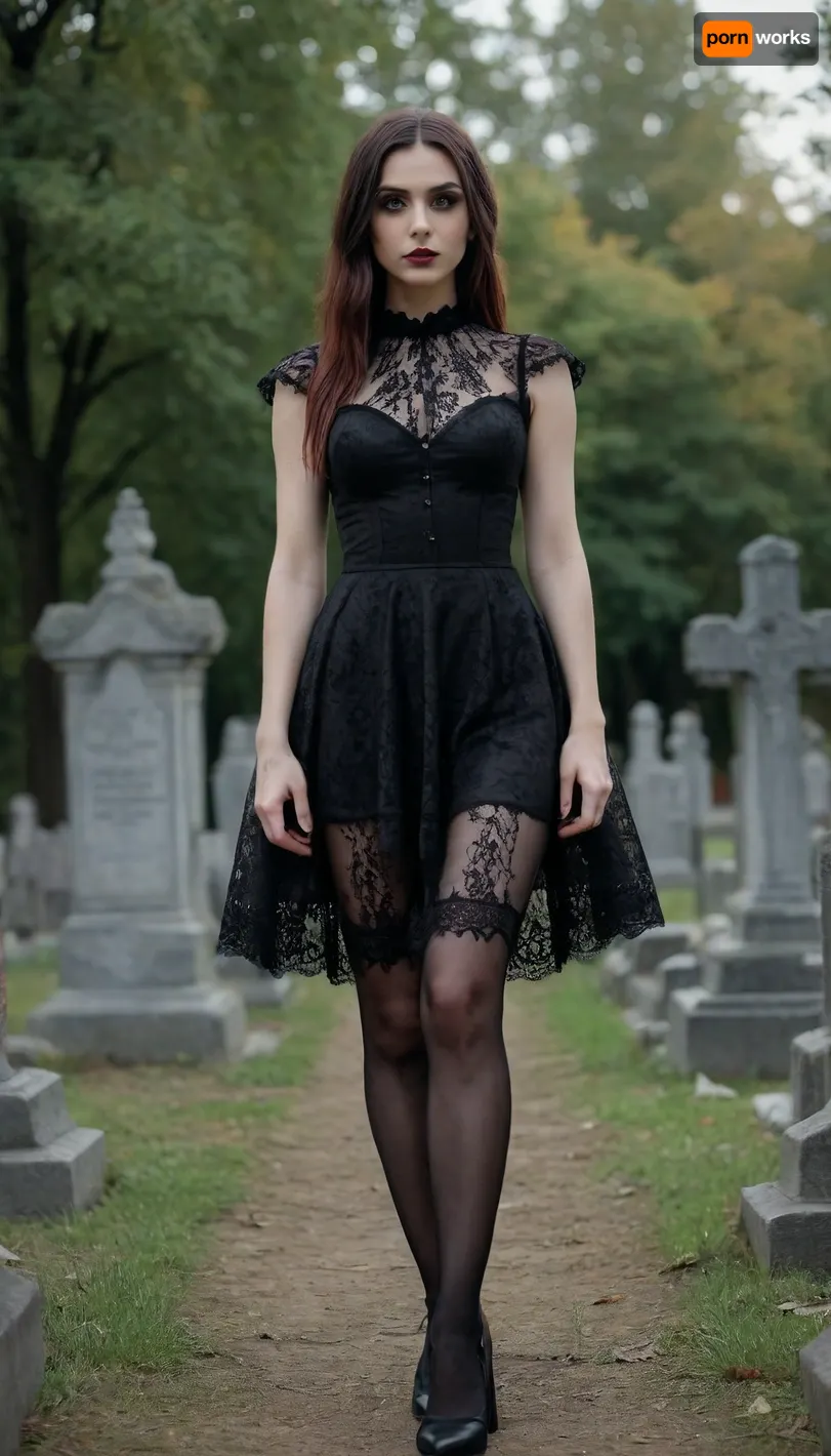 In the heart of a chilling graveyard under a 8k, photoreal and high-quality sky, a group of gothic girls stood tall, their long legs clad in black stockings beneath intricate transparent lace dresses. Their hair, styled in complex Gothic designs, swayed in the wind, while their eyes gleamed with an undeniable allure. Perched on high heels platform, they struck seductive poses, their perfect bodies smooth and toned beneath the moonlight, exuding a sexy slut charm that was impossible to ignore.