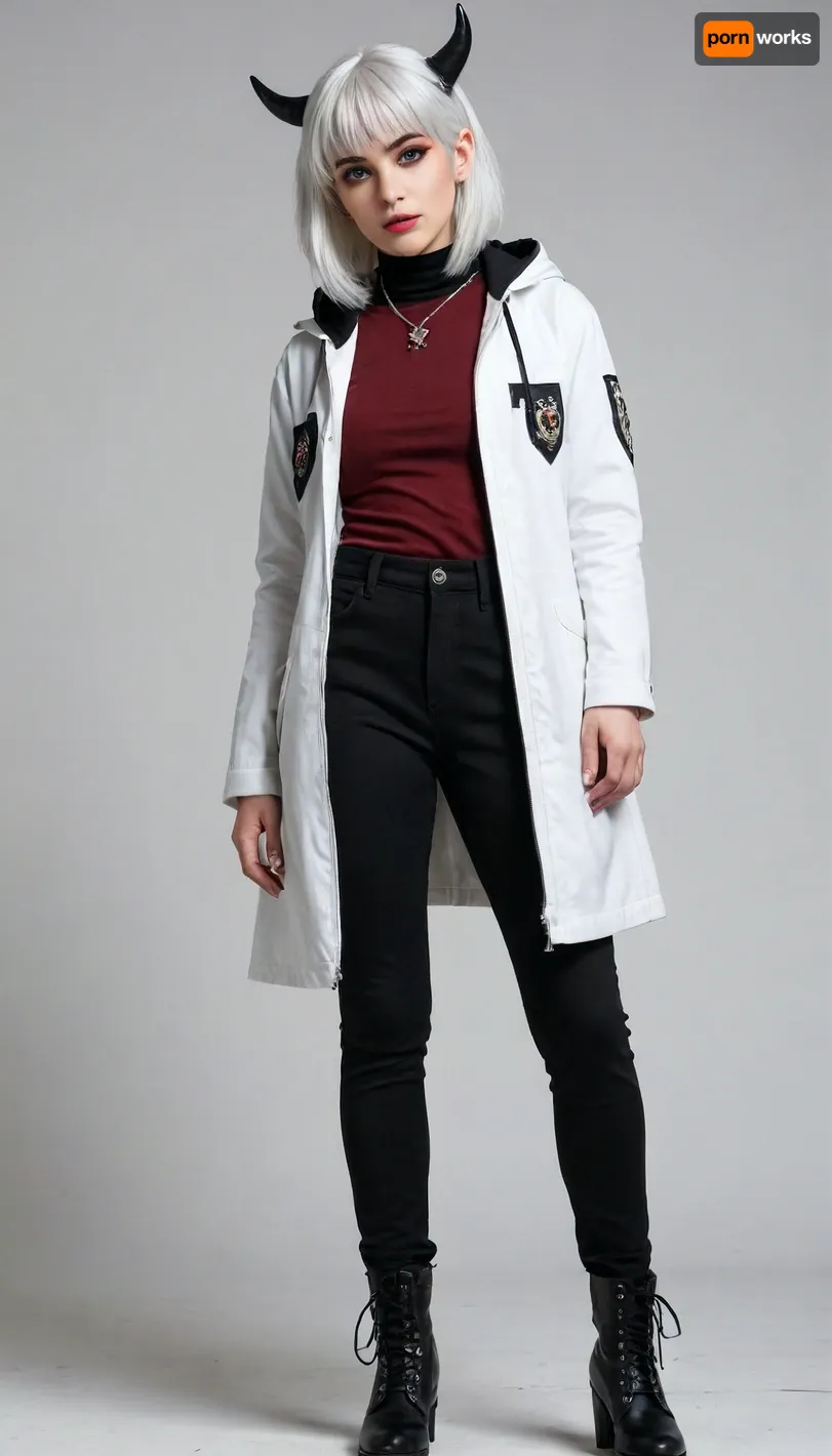 (masterpiece), best quality, very aesthetic, absurdres, highres, amazing quality, newest, 1girl, yellow eyes, tsurime, white hair, long hair, medium bangs, straight hair, demon horns, black horns, demon girl, small breasts, fit, mature woman, [lips], white eyebrows, black jacket, hooded jacket, dark red shirt, t-shirt, choker, ear piercing, black piercing, tucked-in jacket, high-waist pants, black pants, ankle boots, black boots, boot zipper, wide heels, pants tucked in, serious, white background, looking at viewer, hand in pocket, [from below], full body (masterpiece), best quality, very aesthetic, absurdres, highres, amazing quality, newest, 1girl, yellow eyes, tsurime, white hair, long hair, medium bangs, straight hair, demon horns, black horns, demon girl, small breasts, fit, mature woman, [lips], white eyebrows, black jacket, hooded jacket, dark red shirt, t-shirt, choker, ear piercing, black piercing, tucked-in jacket, high-waist pants, black pants, ankle boots, black boots, boot zipper, wide heels, pants tucked in, serious, white background, looking at viewer, hand in pocket, [from below], full body