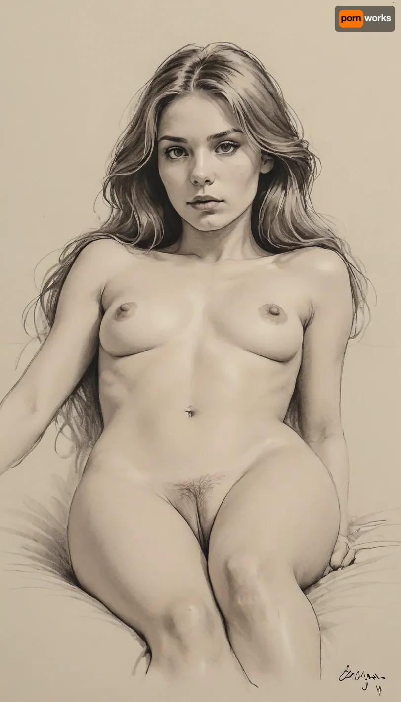 The AI-generated image depicts a serene scene where a nude woman lies on a sofa, her long flowing hair cascading gracefully. The pencil drawing captures her soft features and gentle expression with meticulous shading and clean lines. In the background, simple elements draw attention to the intricate details of her portrait, highlighting the artist's skill in rendering fine pencil strokes.