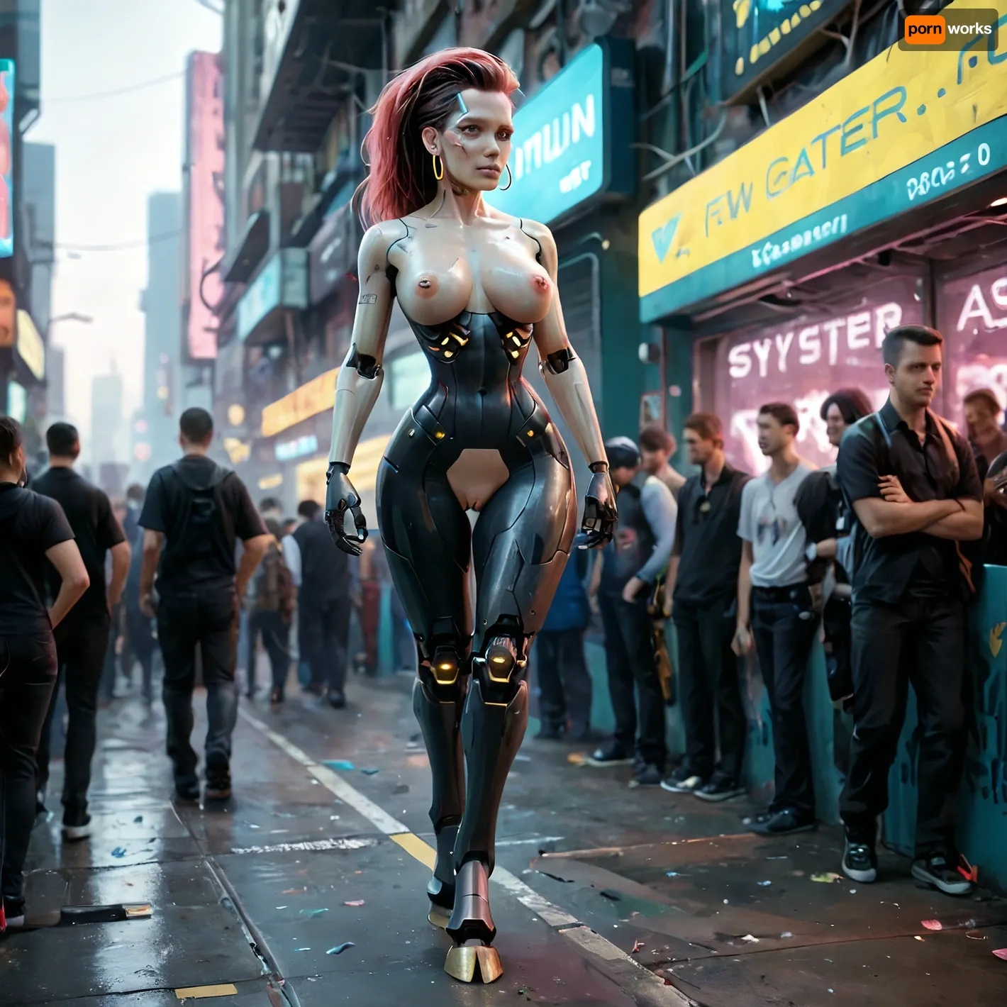 a cyborg redhair woman with robotic body except her boobs and pussy, excybertechsdxl, full body shot, Robot, Skin, Android, walking in cyberpunk park, crowd, hooves, cyber hooves, ((absurdly tight waist)), clitoris, ((vulva)), <lora:robot_skin_XL_1.0.6:.6>, <lora:excybertechsdxl:1.1>, <lora:Microwaist_XL_v01:2>, ((robotic body)) a cyborg redhair woman with robotic body except her boobs and pussy, excybertechsdxl, full body shot, Robot, Skin, Android, walking in cyberpunk park, crowd, hooves, cyber hooves, ((absurdly tight waist)), clitoris, ((vulva)), <lora:robot_skin_XL_1.0.6:.6>, <lora:excybertechsdxl:1.1>, <lora:Microwaist_XL_v01:2>, ((robotic body))