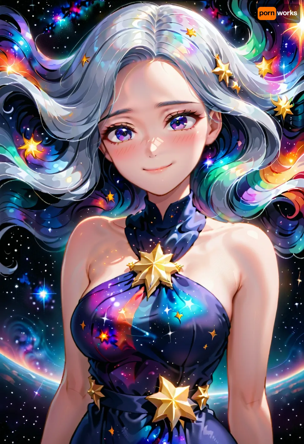 (galaxy:.8), (cosmic nebula:.8), (cuteness:.5), (calmness:1), woman 26 yo, with, (sensual, romantic face), (long silver hair), thin waist