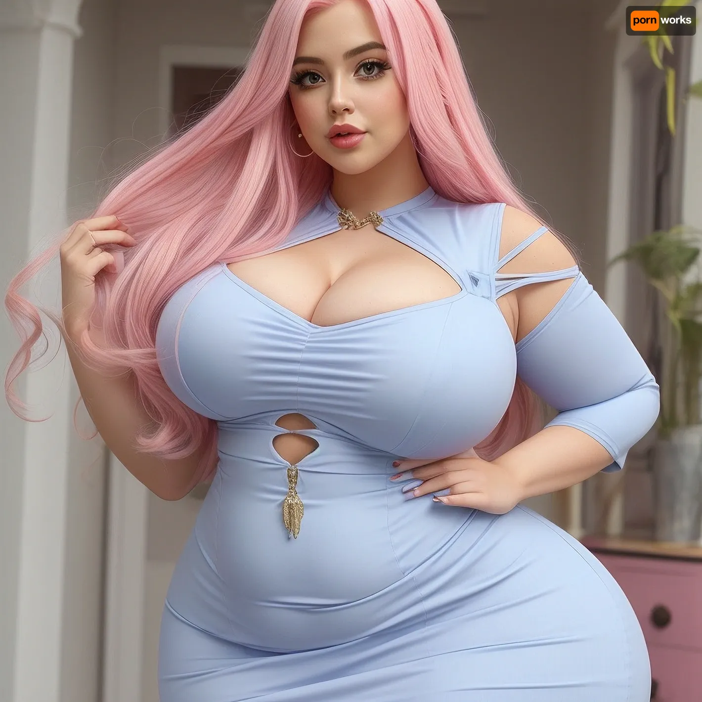 Pretty curvy woman, long pink hair, medium breasts, large ass, blue bodycon dress Pretty curvy woman, long pink hair, medium breasts, large ass, blue bodycon dress