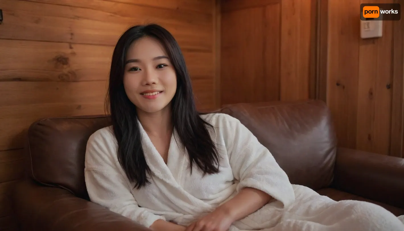 A 30-year-old Asian woman with Long black hair, The woman, Wearing an open white bathrobe, Reclining on a Brown sofa in a small wooden cabin, looking happy and excited. close-up, <lora:hyi:.8>
