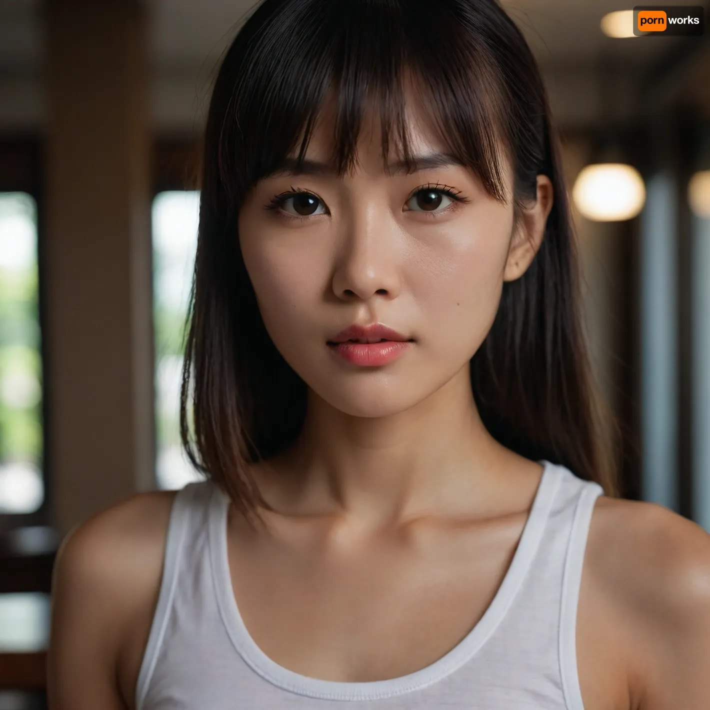 A 25-year-old Taiwanese woman, straight bangs, delicate features, slightly pursed lips, white Cropped tank top, close up, focus on face