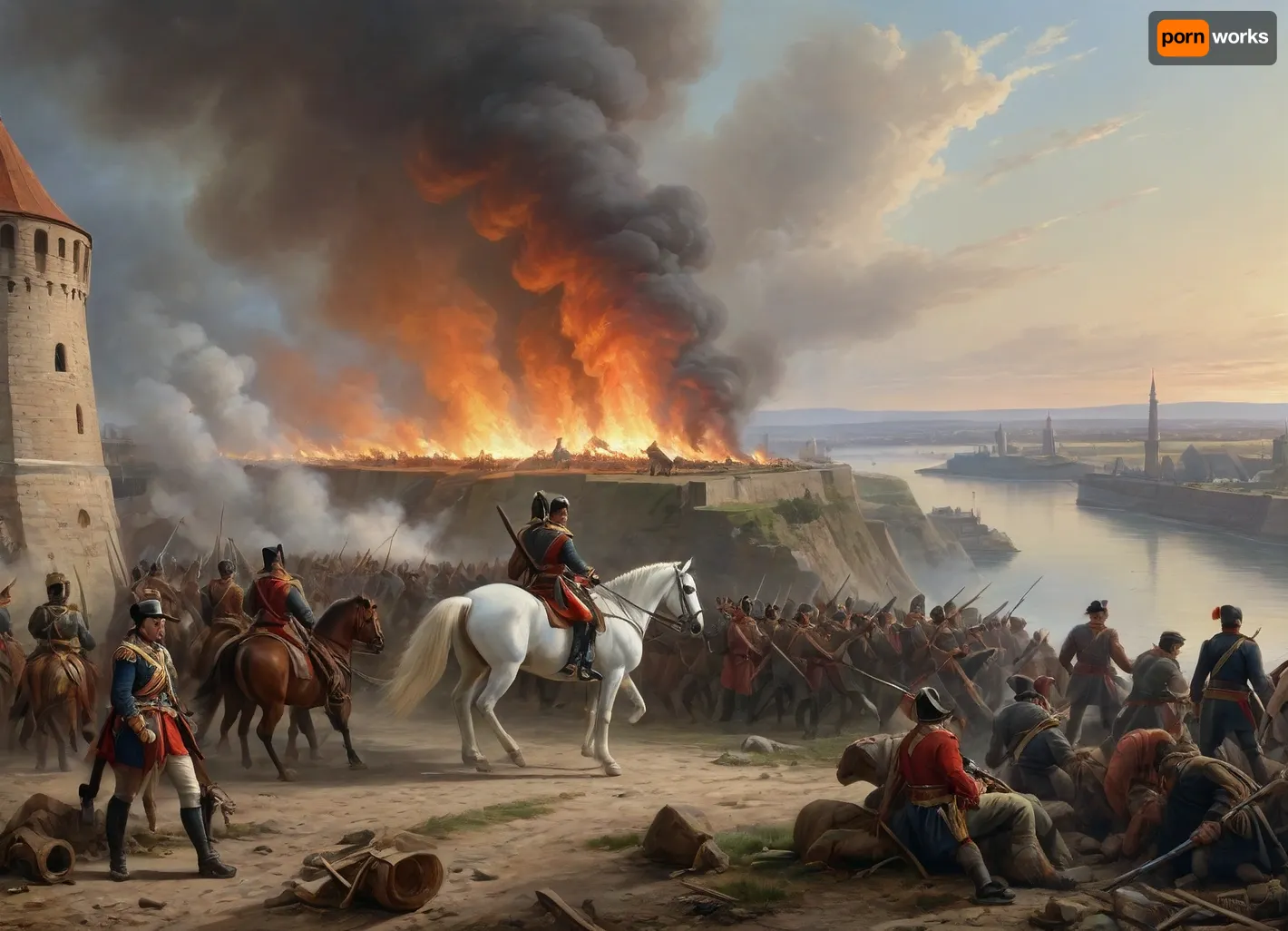 masterpiece, full color image, 8K quality, oil painting by a Russian artist, The painting depicts the very moment of the beginning of the storming of the fortress in the early morning. On the right, in the foreground, there is a cannon, from which Russian gunners fire a signal shot to attack. A.V. Suvorov is shown on the left, sitting on his white horse Mishka, and M.I. Kutuzov is on his right hand. Next to them are Russian soldiers and officers storming the bastions and walls of the burning Turkish fortress of Izmail. On the right side of the painting is the Danube River, where you can see the outlines of the boats of the landing troops. masterpiece, full color image, 8K quality, oil painting by a Russian artist, The painting depicts the very moment of the beginning of the storming of the fortress in the early morning. On the right, in the foreground, there is a cannon, from which Russian gunners fire a signal shot to attack. A.V. Suvorov is shown on the left, sitting on his white horse Mishka, and M.I. Kutuzov is on his right hand. Next to them are Russian soldiers and officers storming the bastions and walls of the burning Turkish fortress of Izmail. On the right side of the painting is the Danube River, where you can see the outlines of the boats of the landing troops.
